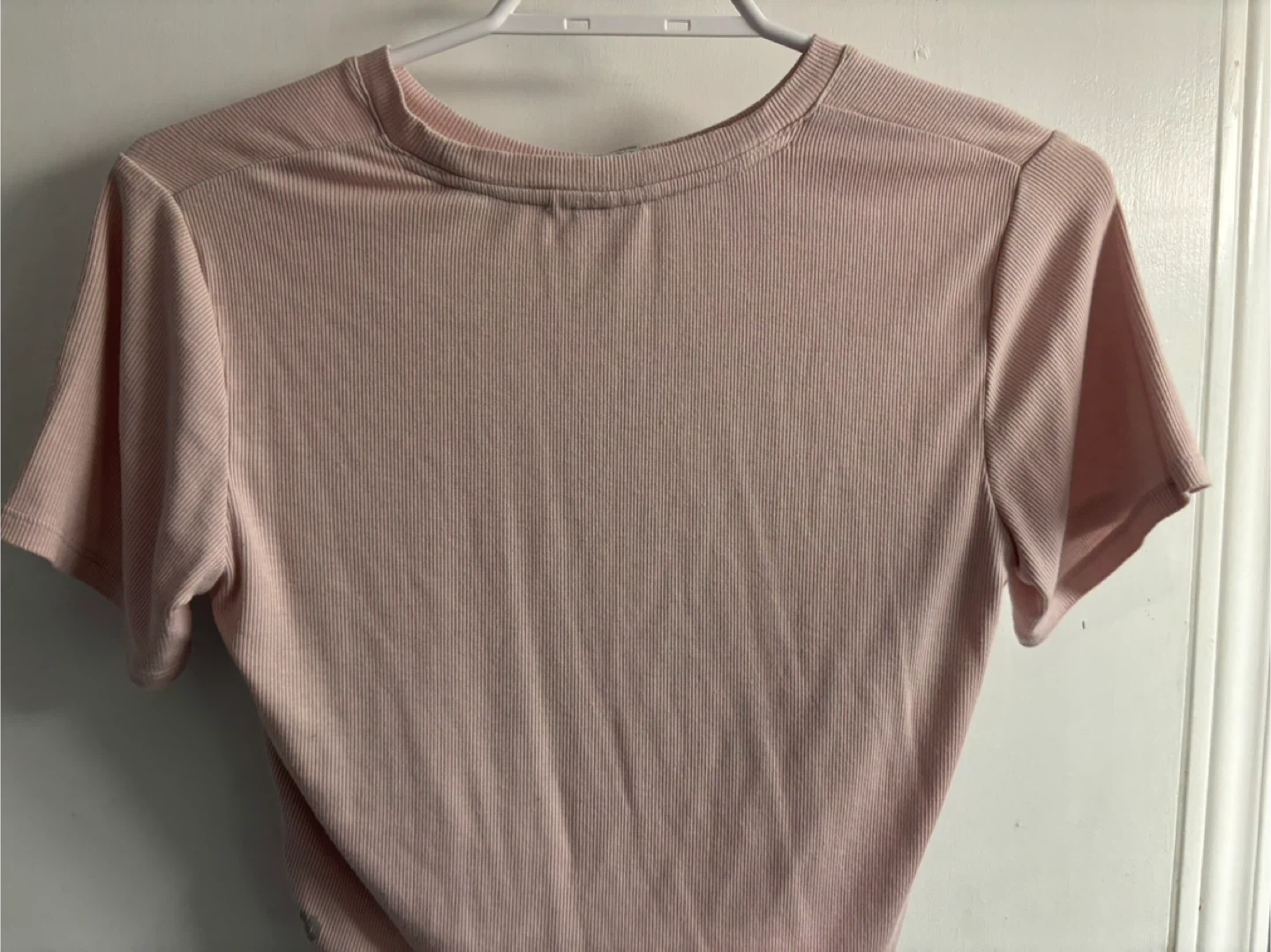 A simple and cute pink ribbed t-shirt. It's in great condition and ready for a new home! The ribbed texture adds a bit of detail to this basic tee. Perfect for casual wear or layering size 14