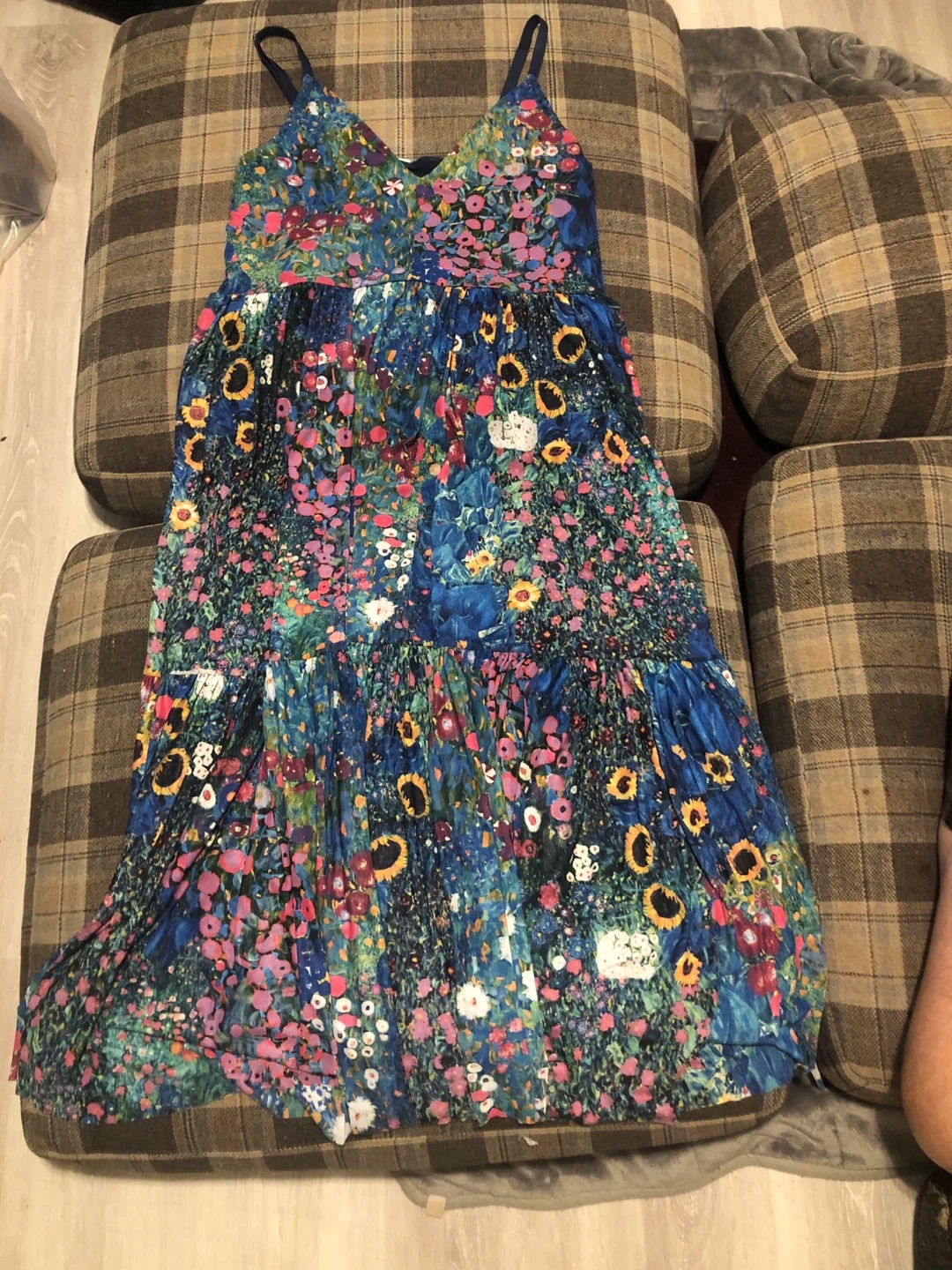 Beautiful floral print maxi dress. It has a vibrant and colourful design featuring sunflowers and other flowers on a blue background. Perfect for summer or any occasion where you want to make a statement