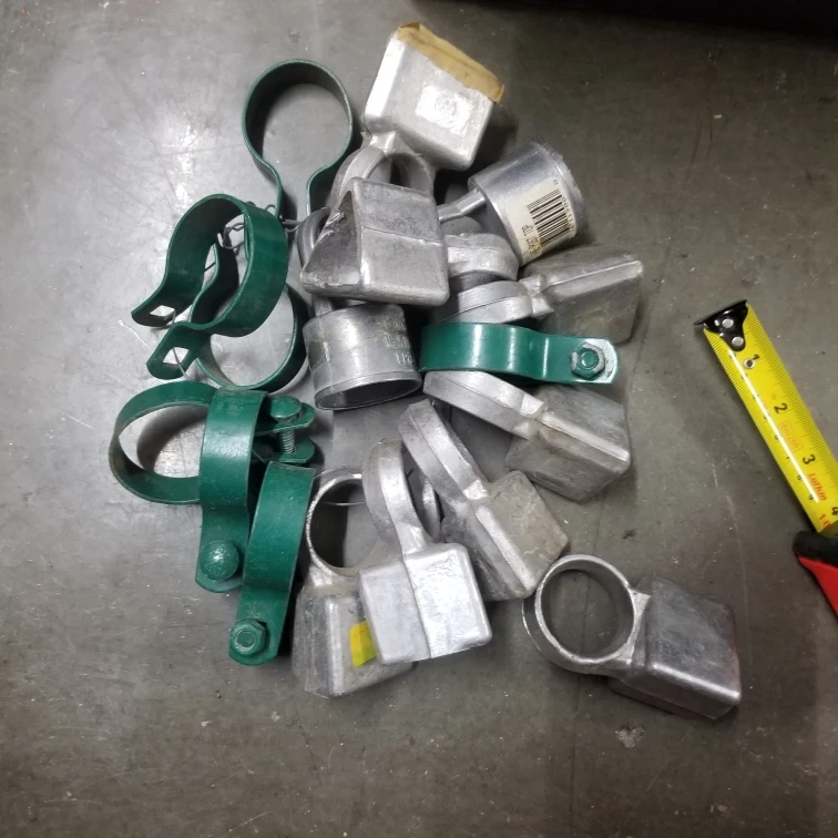 Selling a lot of fence post hardware. Includes a mix of green and silver pieces as shown in the photos. Good for fence repairs or new installations