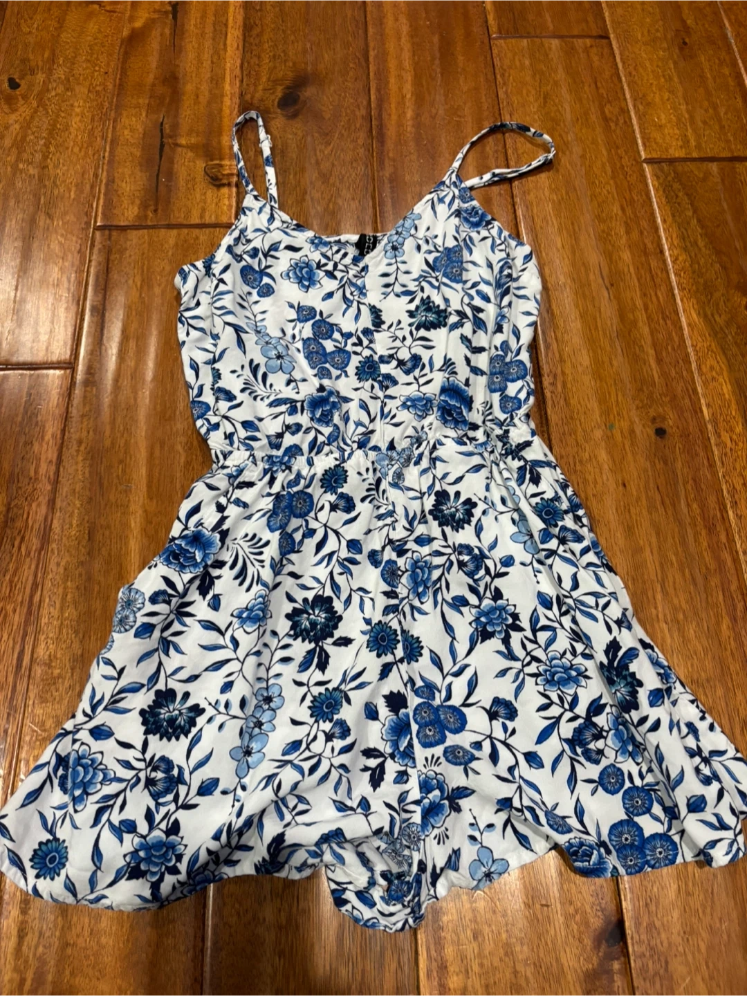 This adorable H&M romper features a lovely blue floral pattern on a white background. It's perfect for warm weather and casual outings. The size is not indicated, but it appears to be a small or medium. It's in great condition and ready for a new home!