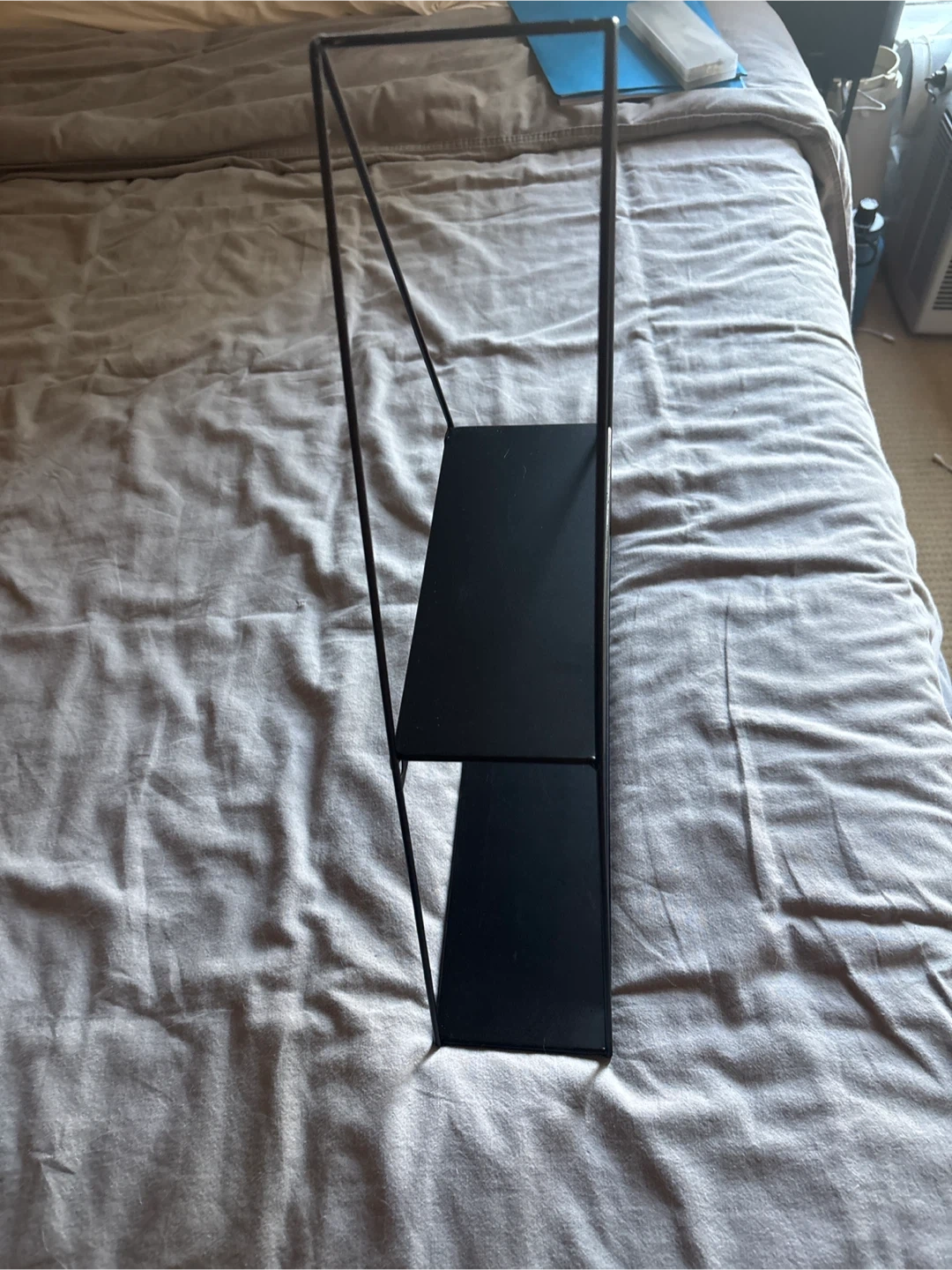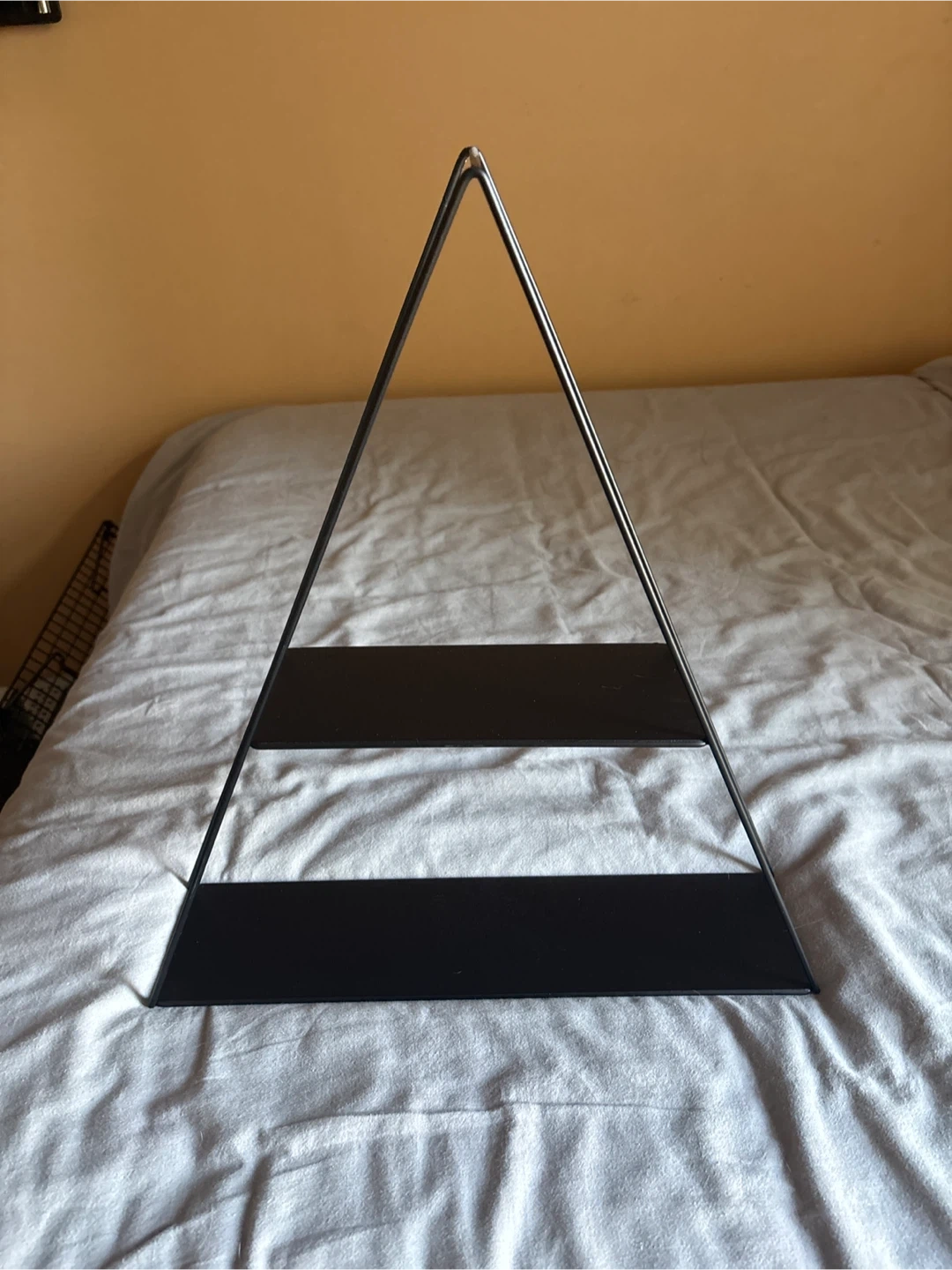 92Looking to add a modern touch to your space? This black metal triangle shelf is just the thing! It's in great condition and ready to hold your favourite books, plants, or decorative items. Its unique design makes it a standout piece for any room