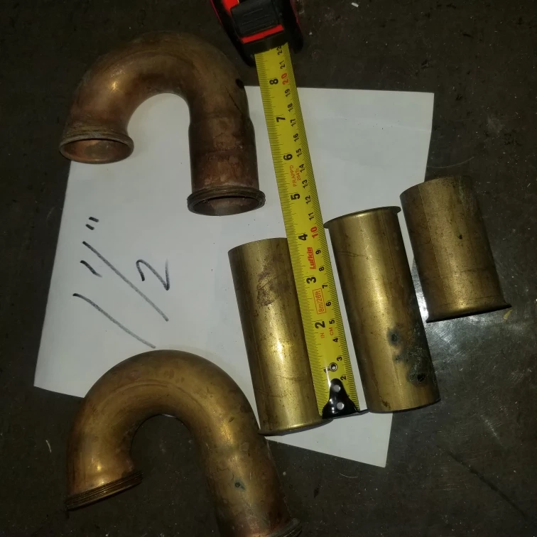 Selling a set of new brass plumbing parts. Includes two curved pipes and three cylindrical fittings. The pipes appear to be approximately 1 1/2 inches in diameter.