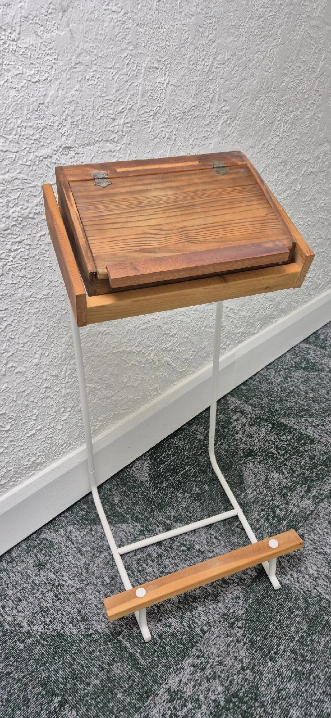 266Selling a charming standing desk with a flip-top. It features a wooden top with a unique grain pattern and a sturdy white metal frame. Keep supplies, notes, etc., in the cozy compartment as you work away. Perfect as a small desk or as a unique piece for small spaces! ---- PICK-UP ONLY Weekdays: 4 -10 pm Weekends/Holidays: 11am - 9 pm
