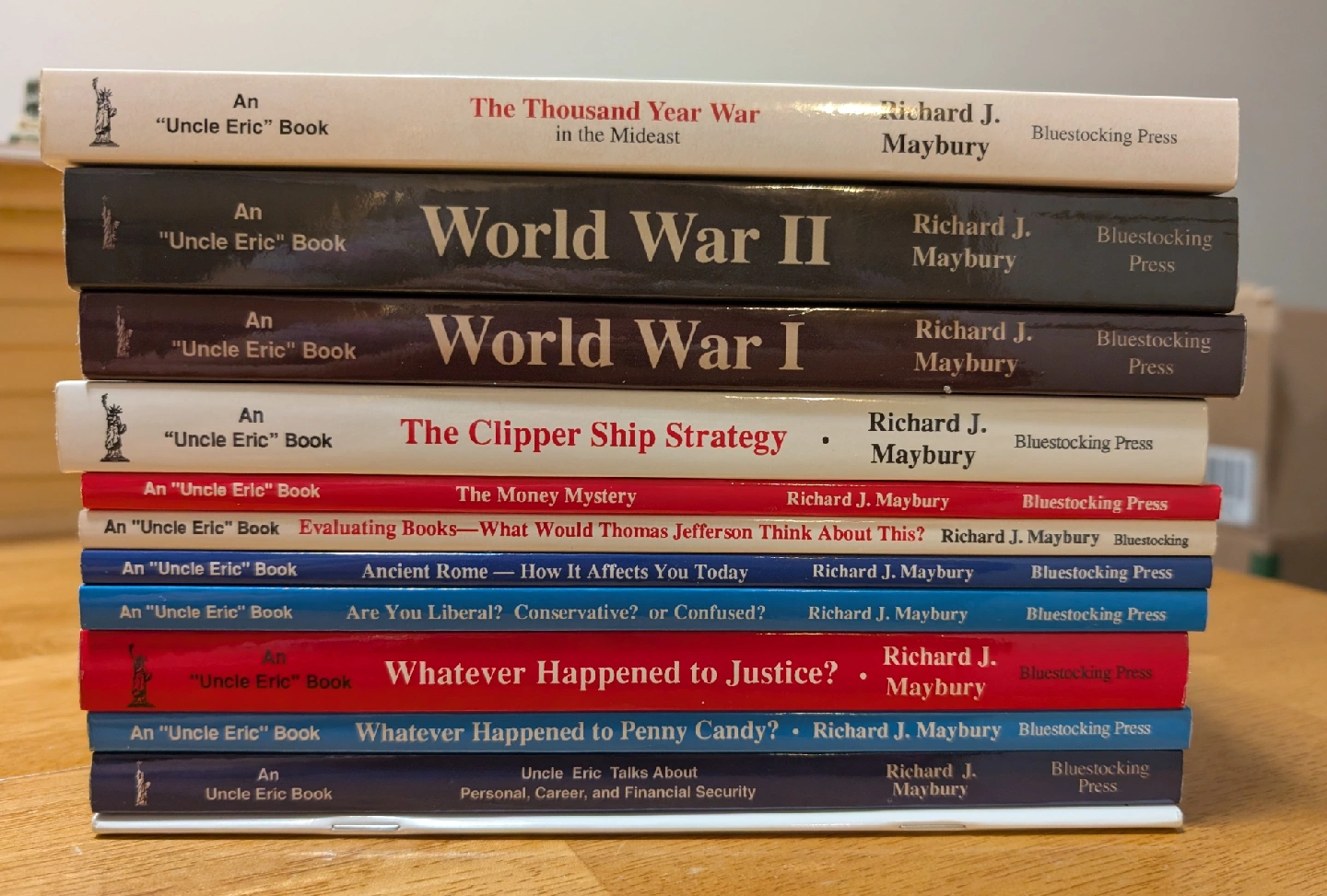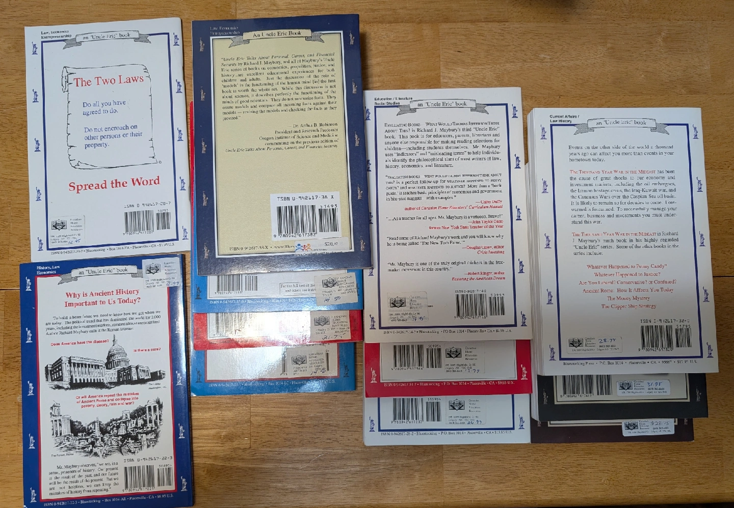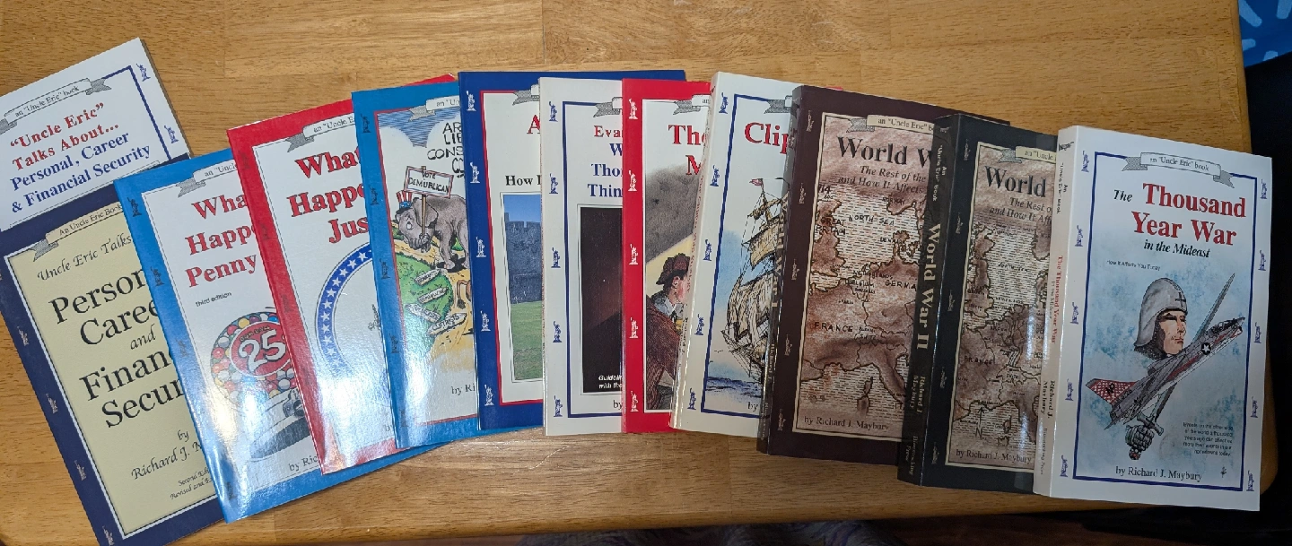 - Uncle Eric Talks About Personal, Career, & Financial (both original and 2nd edition) - Whatever Happened to Penny Candy? (3rd Edition) - Whatever Happened to Justice? - Are You Liberal? Conservative? Confused? - Ancient Rome: How It Affects You Today - Evaluating Books: What Would Thomas Jefferson Think About This? - Money Mystery - Clipper Ship Strategy Plus the books: The Thousand Year War, World War I and World War II Twelve in total. In great condition, I think in like new condition. At the time we purchased them we paid $241.52 plus GST. You can see the price tags in one of the pictures. Asking $85 but open to reasonable offers. Pick up only in the Beltline. Cash only. FCFS. I'm flexible on pick up times but please don't no-show.