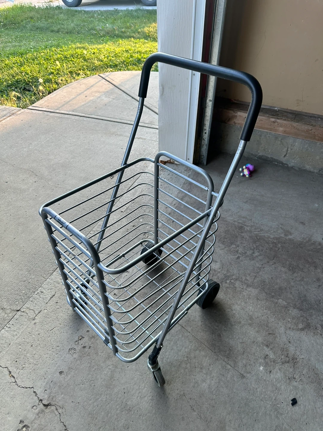 Here's a handy folding shopping cart, perfect for trips to the grocery store or farmer's market! It's in great shape and ready to roll. The folding design makes it easy to store when not in use $40