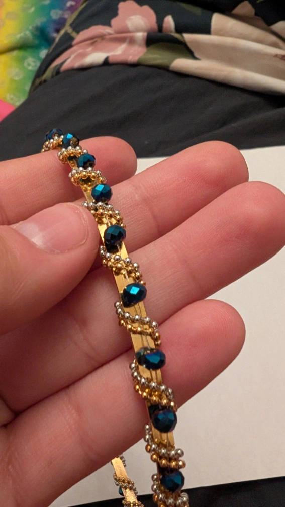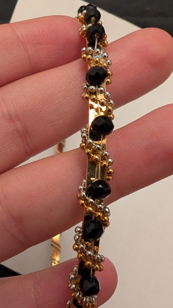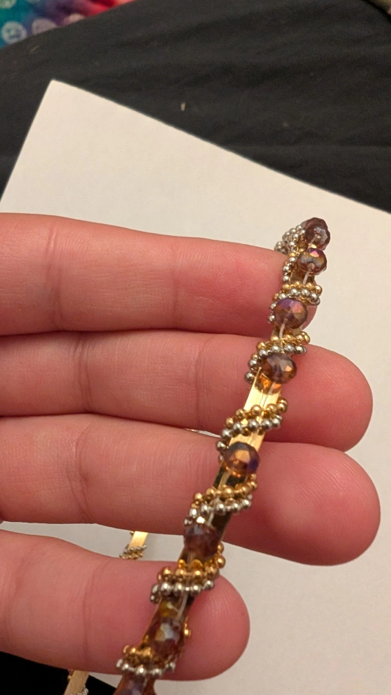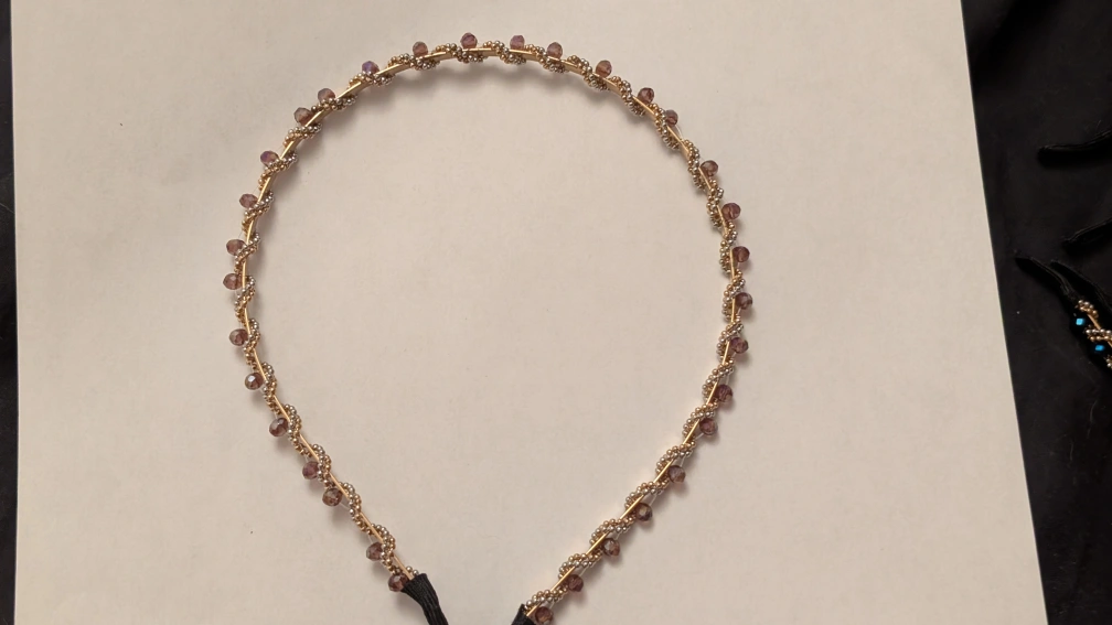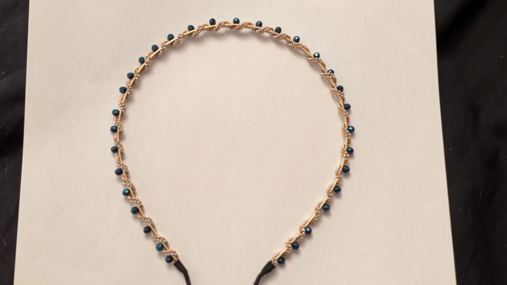 I'm selling these cute beaded headbands! They feature a gold band with delicate beading in blue, pink, and black. They're perfect for adding a touch of sparkle to any outfit!