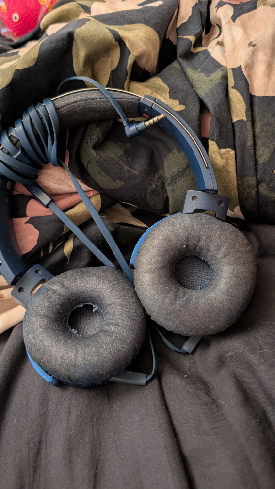 Selling a pair of blue headphones. They show signs of wear on the earcups, as you can see in the photos. Still functional, but the earcups have some wear and tear