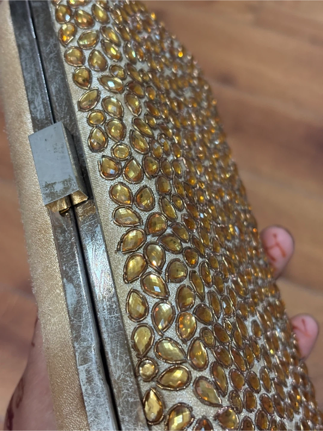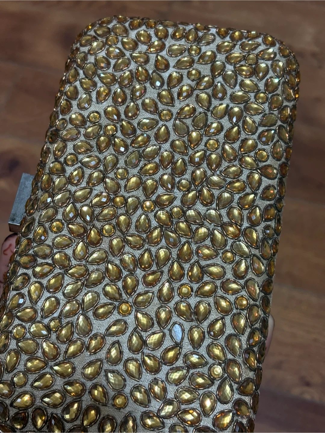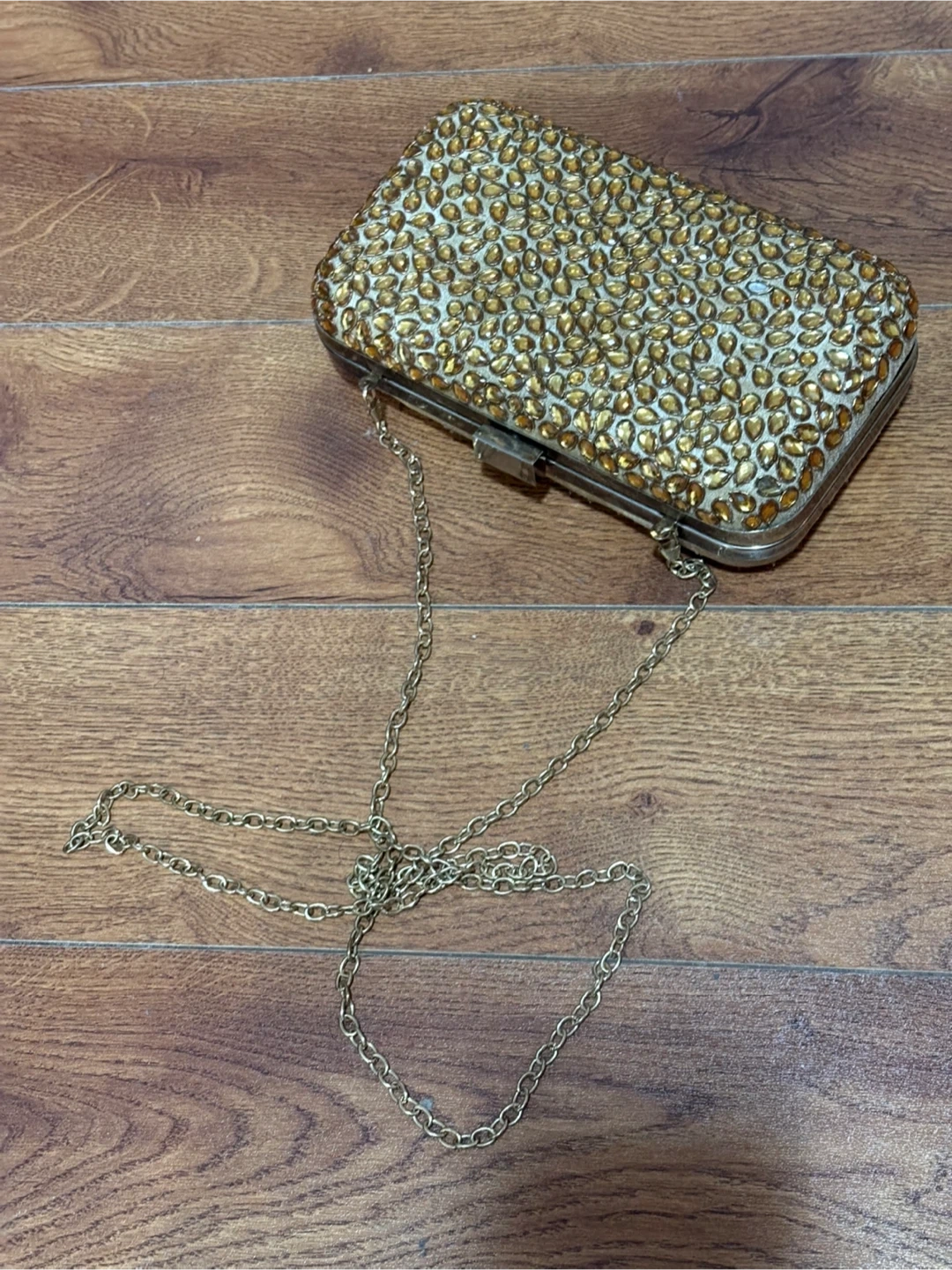 1000+Selling a beautiful gold clutch, perfect for evenings out or special occasions! The clutch is embellished with stones and has a metallic trim. It's in great condition and ready for a new home