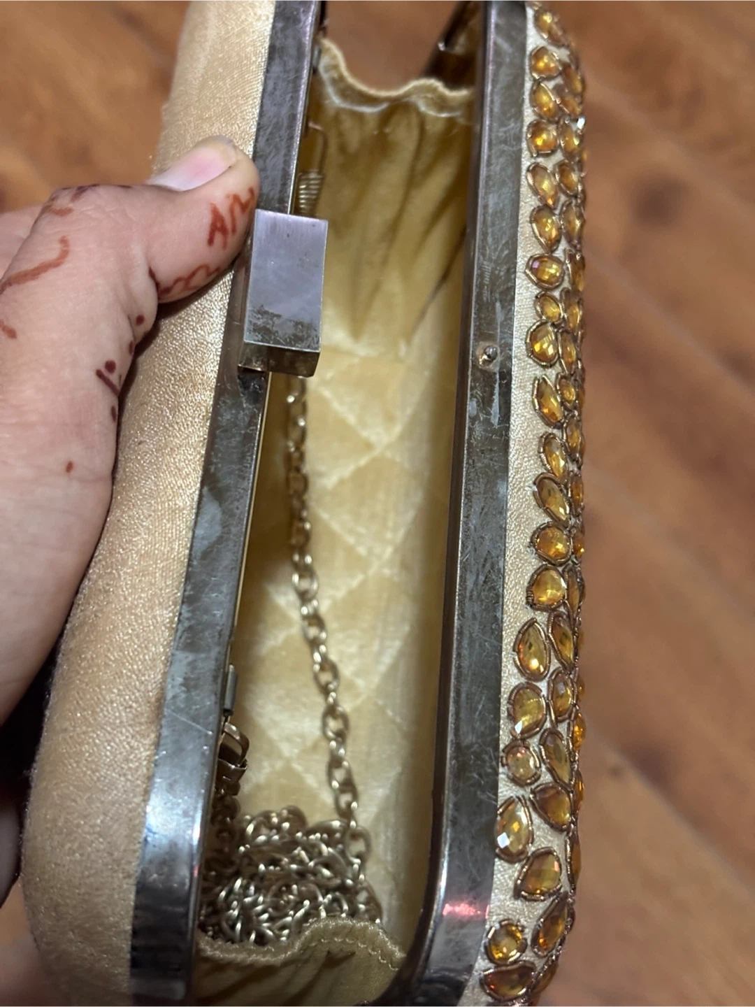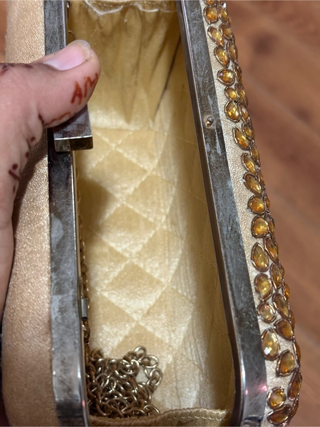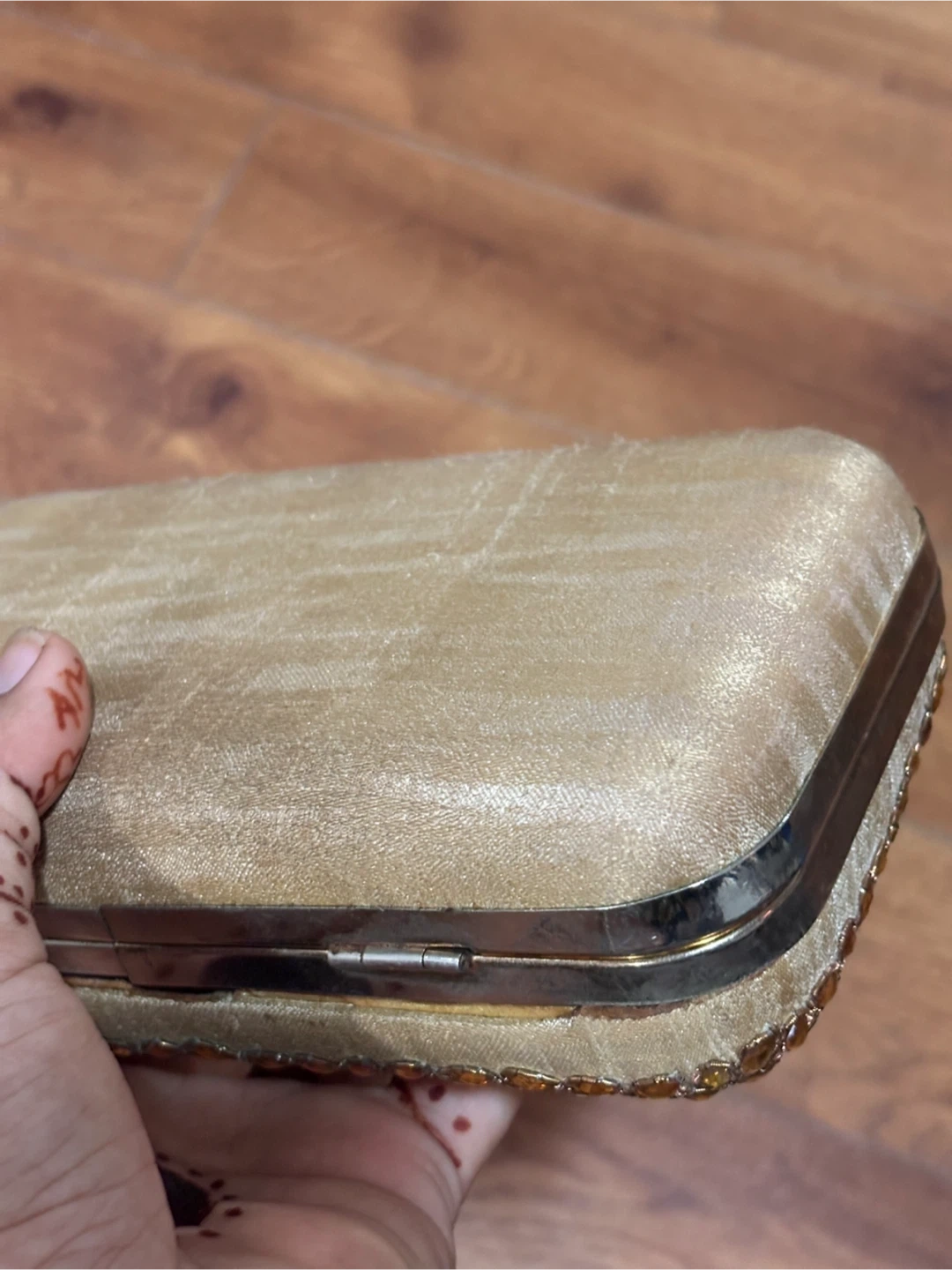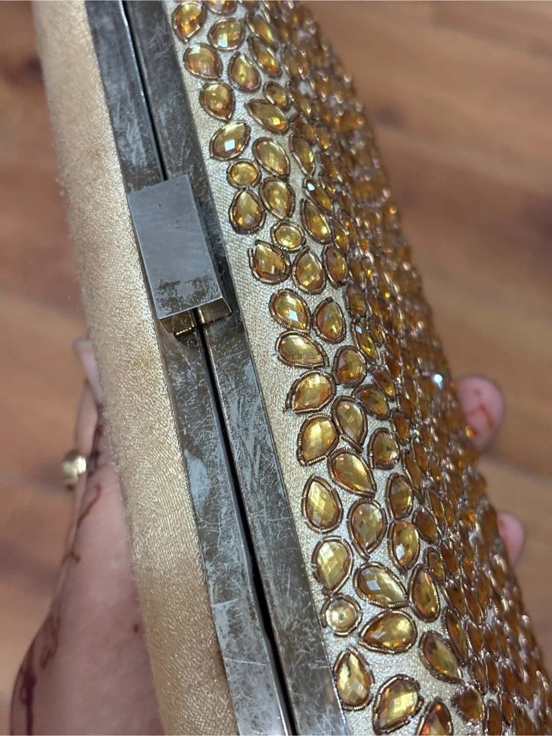 1000+Selling a beautiful gold clutch, perfect for evenings out or special occasions! The clutch is embellished with stones and has a metallic trim. It's in great condition and ready for a new home
