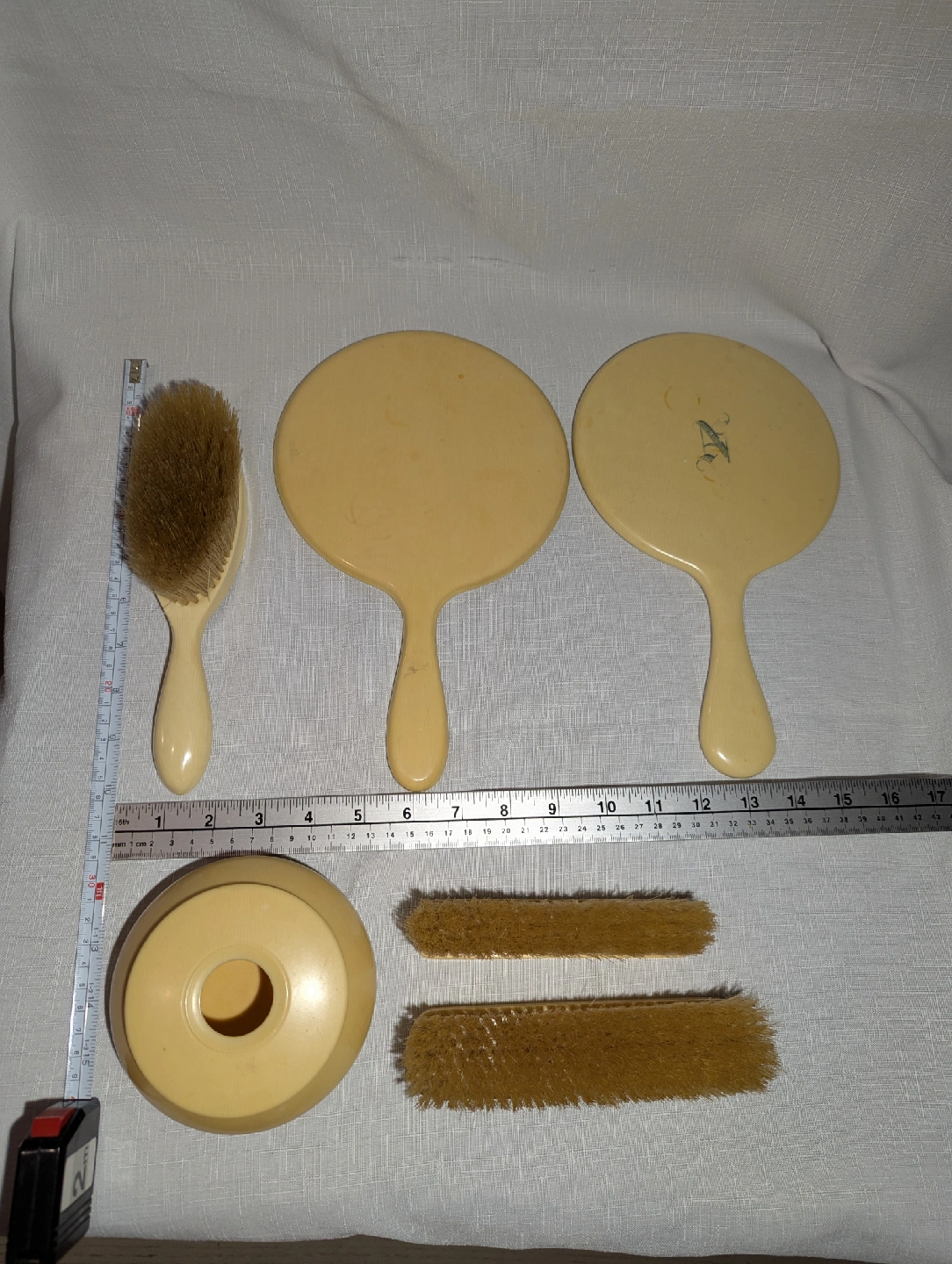 Selling vintage brushes, mirrors and more! Selling as a group. It includes 2 hand mirrors, 3 brushes and a cotton ball holder. Perfect for adding a touch of old-fashioned elegance to your dresser or bathroom. The set is in good vintage condition. 2 are marked Birks. 1 is marked Keystone and one says French Ivory. Brushes never used.