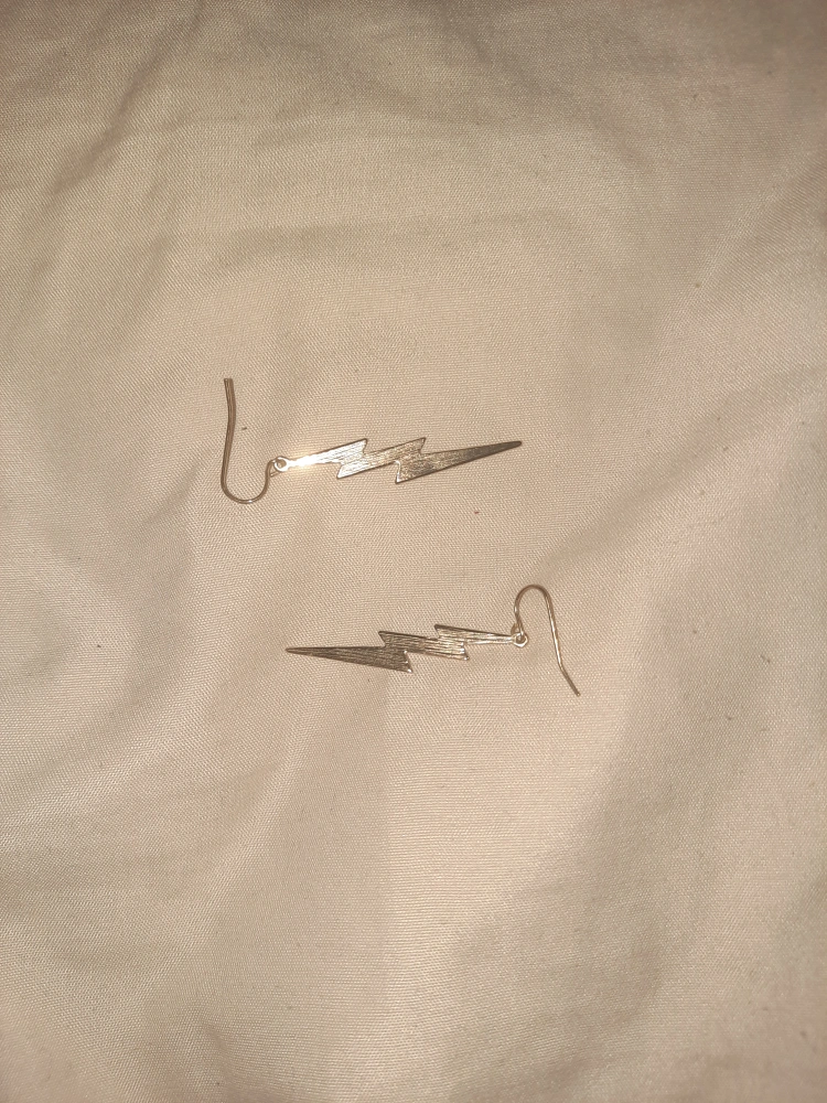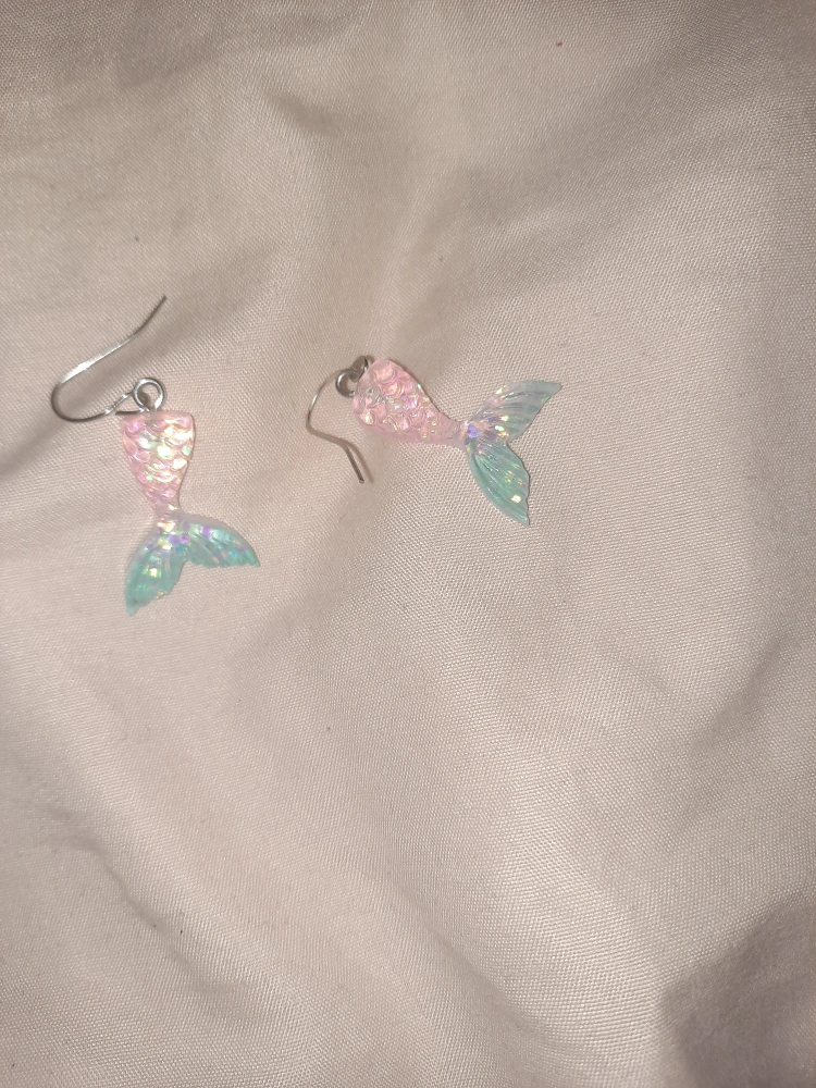 items 1 is in the image are a pair of gold colored lightning bolt drop earrings. These earrings feature a jagged lightning bolt design $2.00 , item 2 is a fashion accessories feature multiple small, square or diamond-shaped pieces with silver, gold, and copper-tone finishes. Some pieces have a glitter or textured finish, while others are smooth. The components are linked together to create a chandelier or cascade effect and hang from fishhook ear wires. $ 2.00 item 3 is a image are Mermaid tail designs often symbolize beauty, luck, love, and wisdom for $2.00 or all for $ 6.00