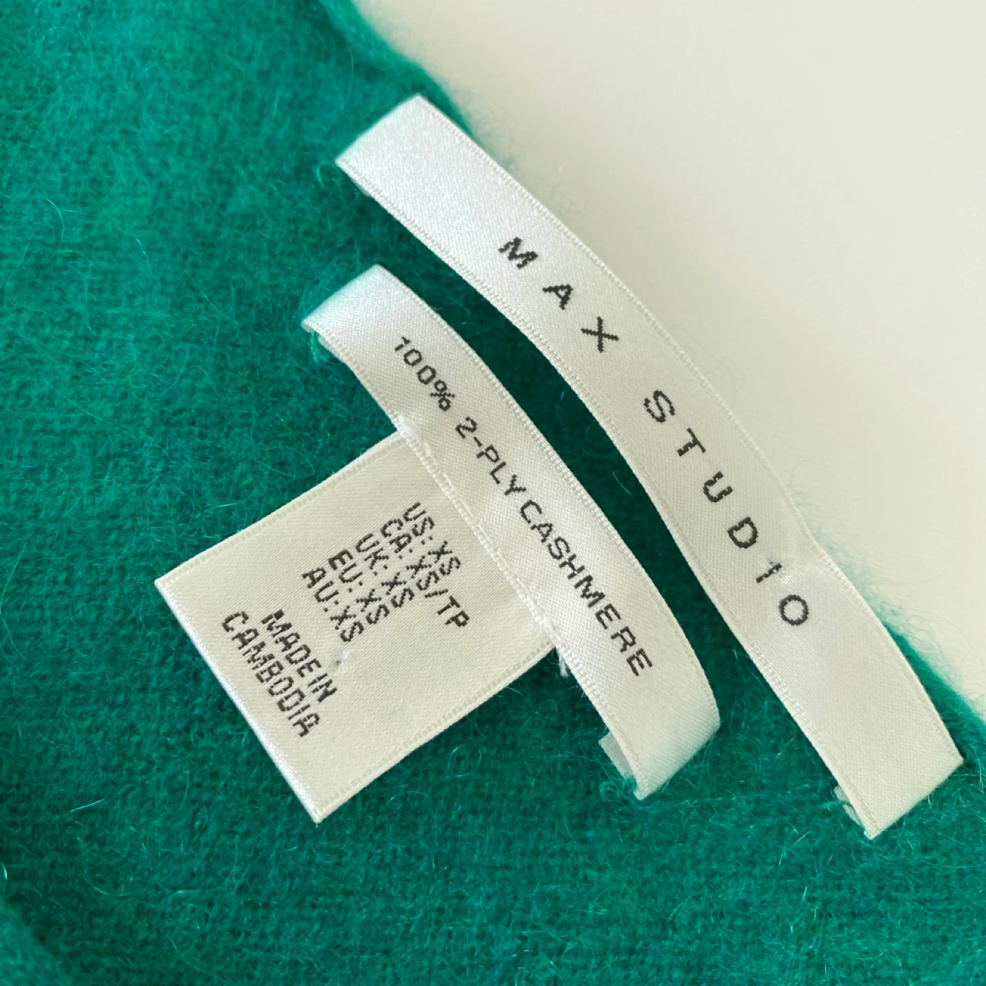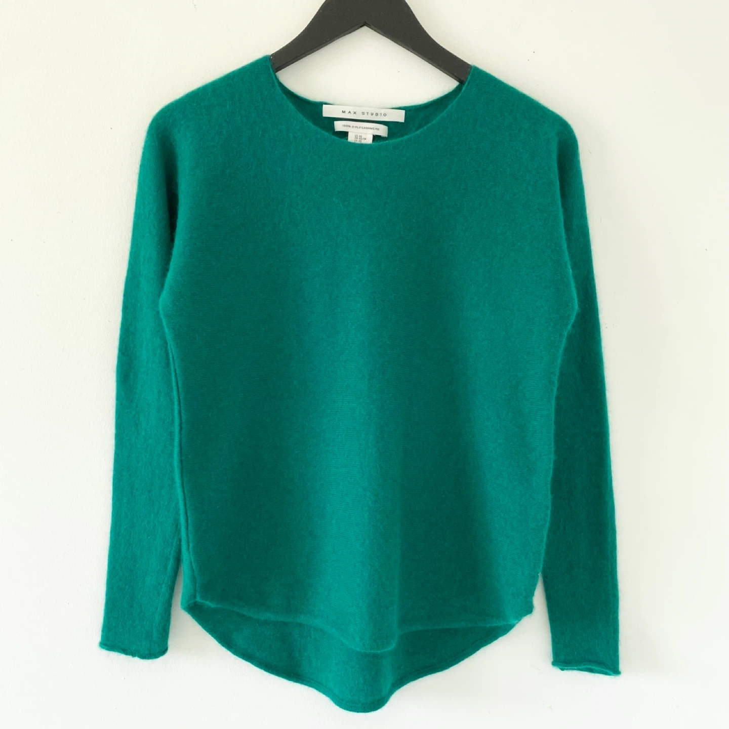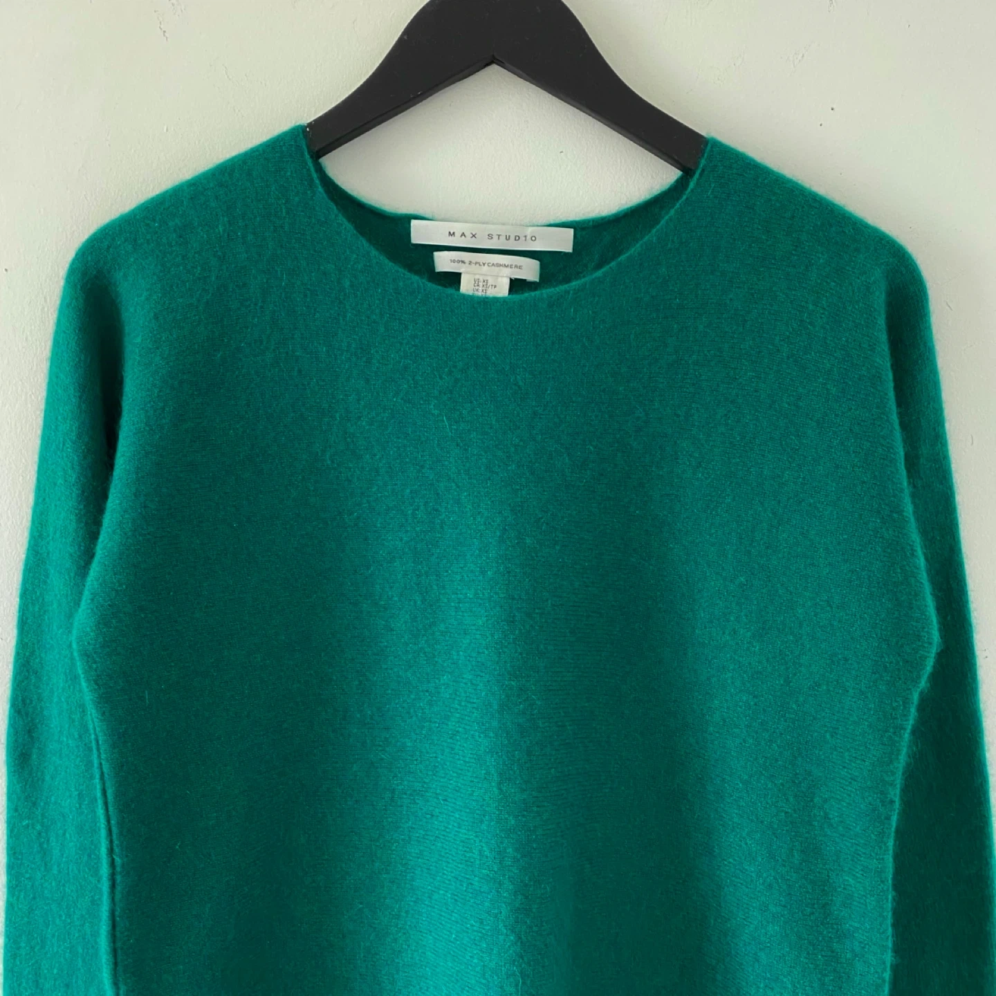 615Pick up only in Leslieville (Queen and Pape) Check out other listings! Max Studio Made of lightweight 100% 2-ply cashmere in an emerald green colour. It's incredibly soft, cozy and luxe. There was a teeny-tiny hole at the back hem which has been mended as per the last pic. It's barely visible. Otherwise it's clean and in excellent condition. Size XS Approximate measurements laid flat Pit to pit 18.5” Center back length 23”