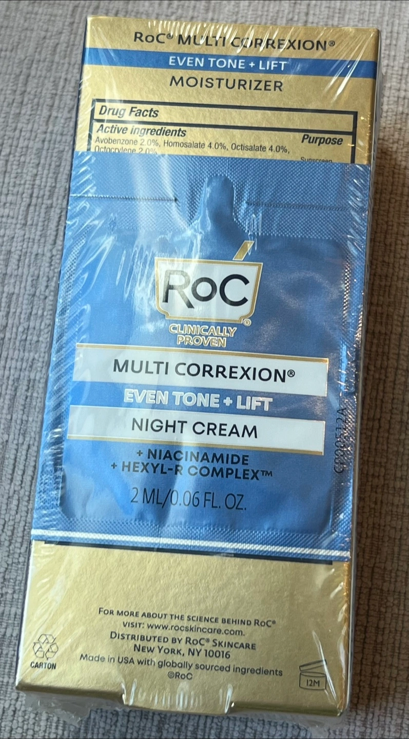 I'm selling a RoC Multi Correxion Even Tone + Lift Moisturizer with SPF 30. It visibly firms and 90% saw a more even skin tone. It also contains Niacinamide. The size is 1.7 fl oz (50 mL). This also comes with a night cream sample (2 mL/0.06 fl oz). The expiration date is July 2027