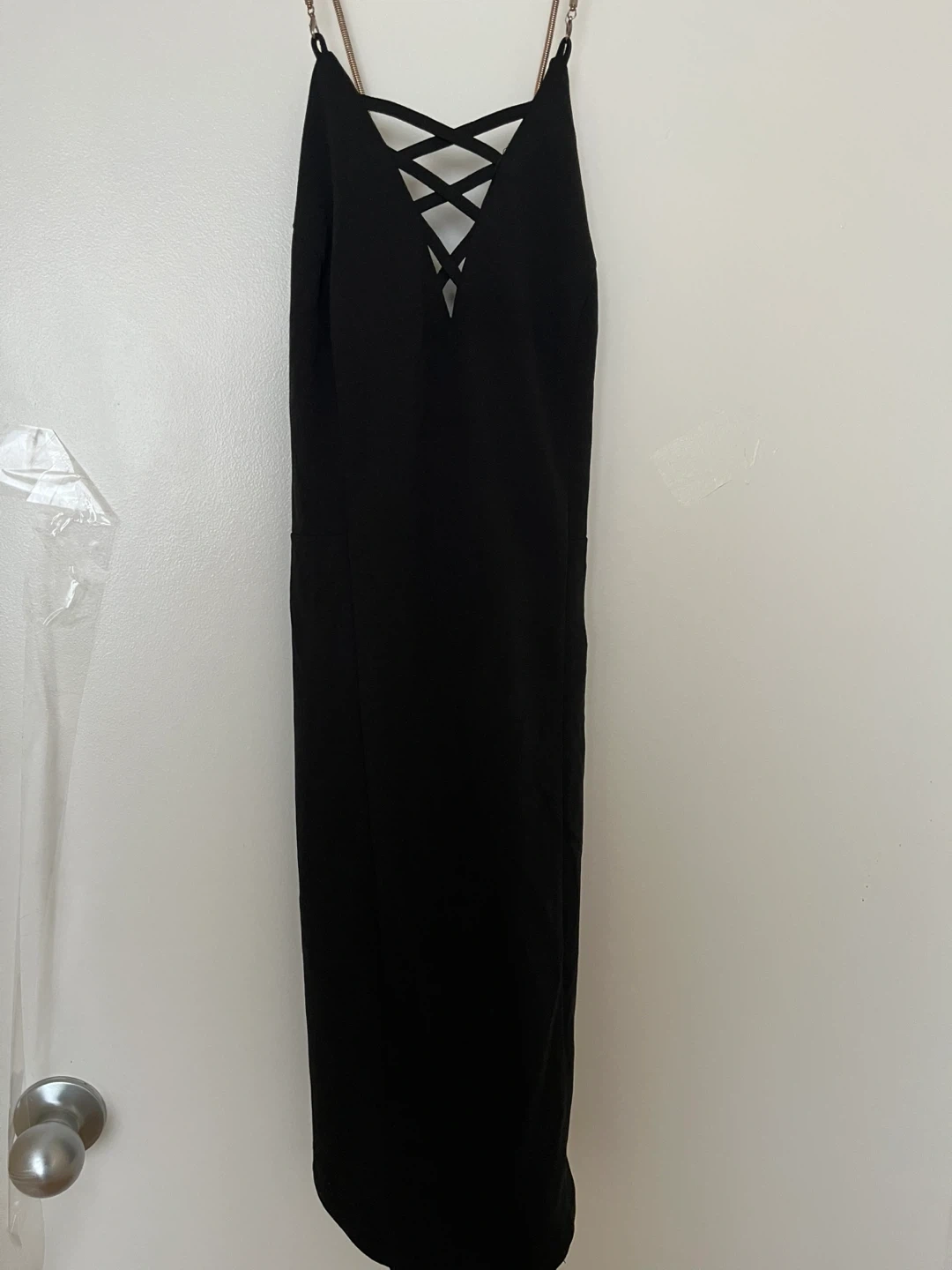 73Selling a cute black mini dress! It features a unique criss-cross back design and delicate gold straps. It's perfect for a night out or a special occasion! The dress is in great condition.