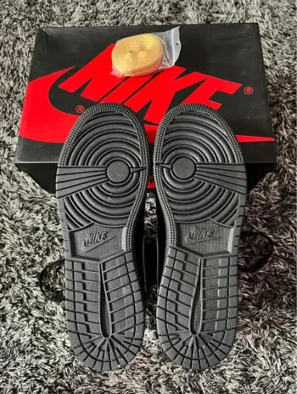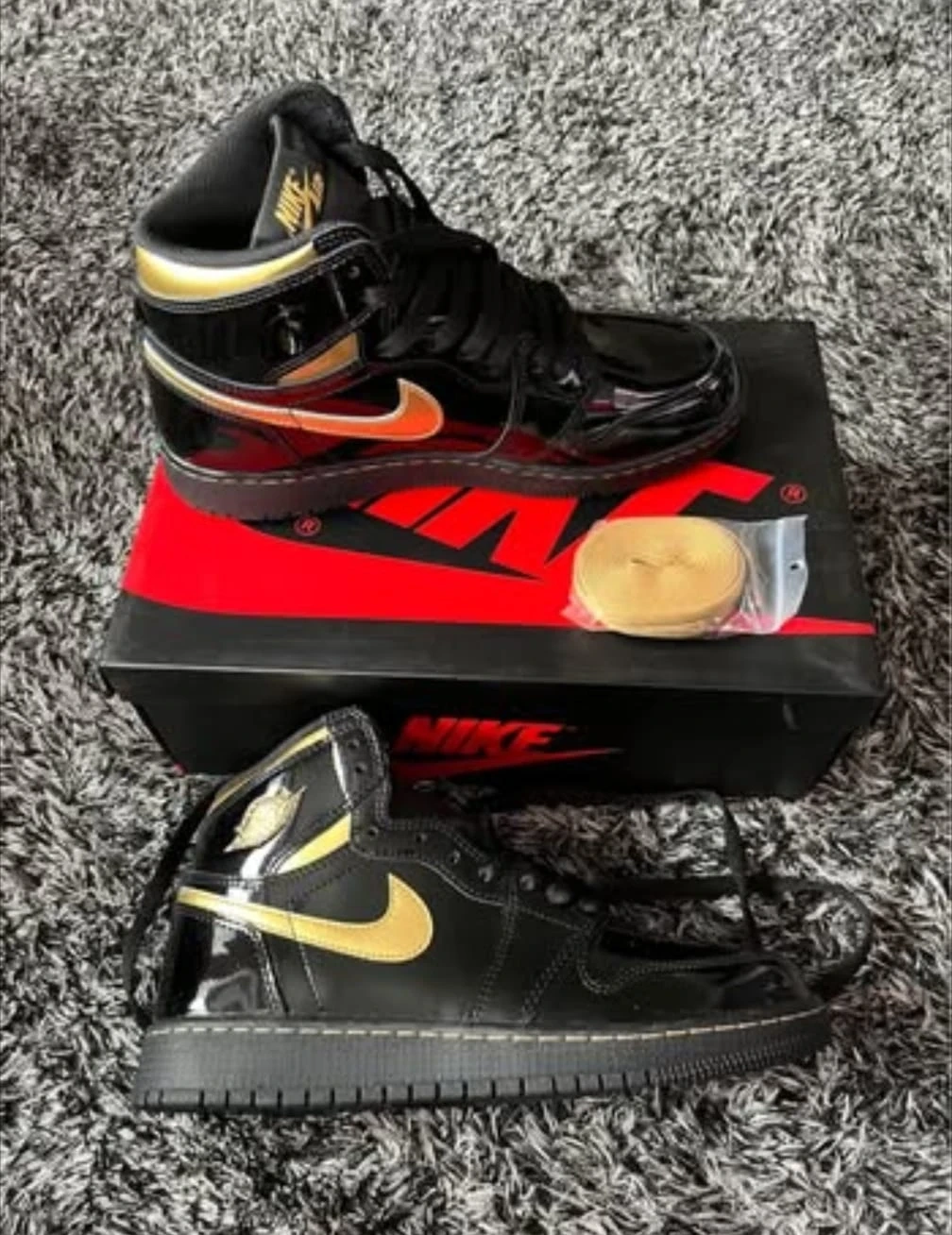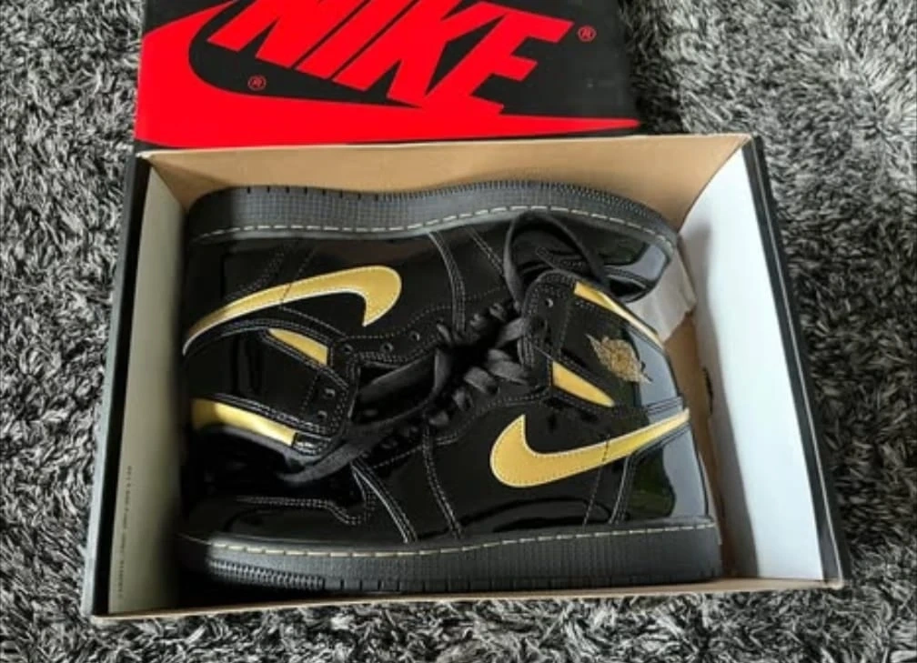 These are Nike Air Jordan 1 High OG sneakers in a black and gold colourway. They feature patent leather uppers and come with extra laces. The original box is included. These kicks are perfect for sneakerheads looking for a classic high-top style with a premium finish.