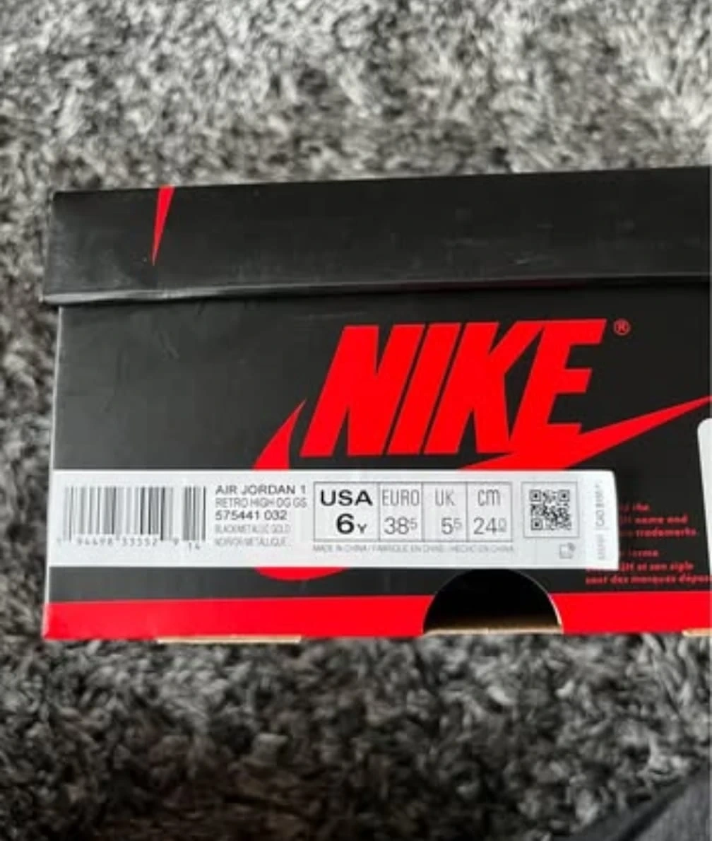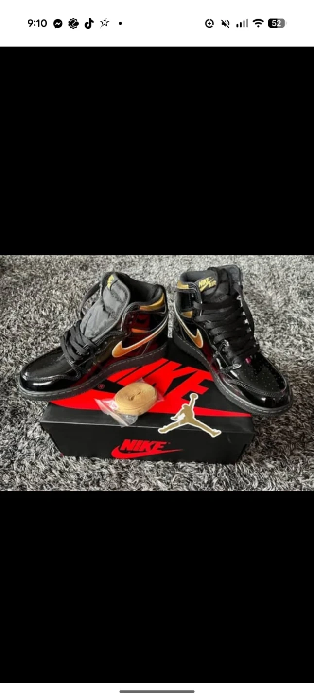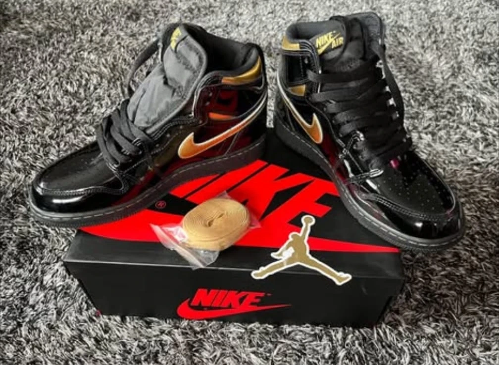 These are Nike Air Jordan 1 High OG sneakers in a black and gold colourway. They feature patent leather uppers and come with extra laces. The original box is included. These kicks are perfect for sneakerheads looking for a classic high-top style with a premium finish.