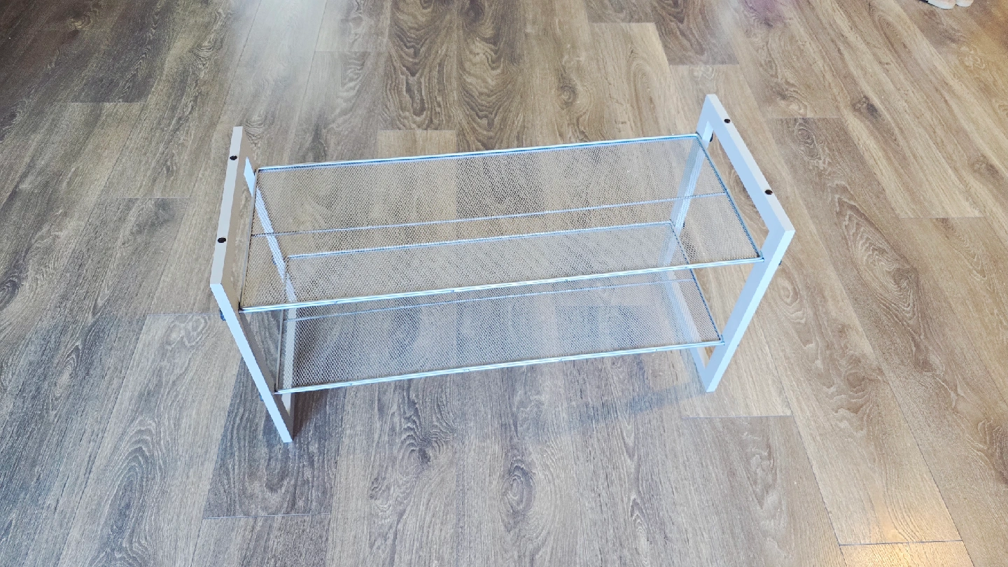 Selling a handy two-tier shoe rack! It's a great way to keep your entryway or closet organized. The rack is made of white metal with a mesh design, so it's both sturdy and stylish. Perfect for keeping your shoes neatly stored and easily accessible