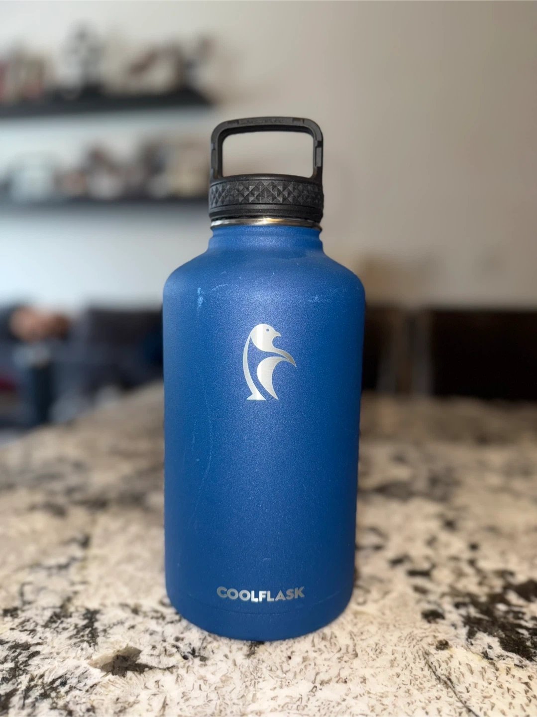Stainless steel insulated Coolflask jug (64 oz) with carrying sleeve, straw, and 2 lids (handle, flip-straw). Wide mouth. Works great. Clean and ready to use. Some exterior scuffs. Pickup: Dufferin & Wilson / Yorkdale.