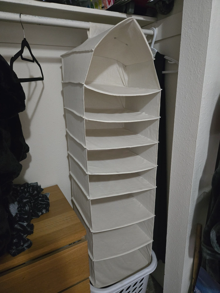 Declutter your closet with this handy hanging organizer! It's perfect for shoes, sweaters, or anything you need to keep tidy. The neutral beige colour will fit right in with any decor