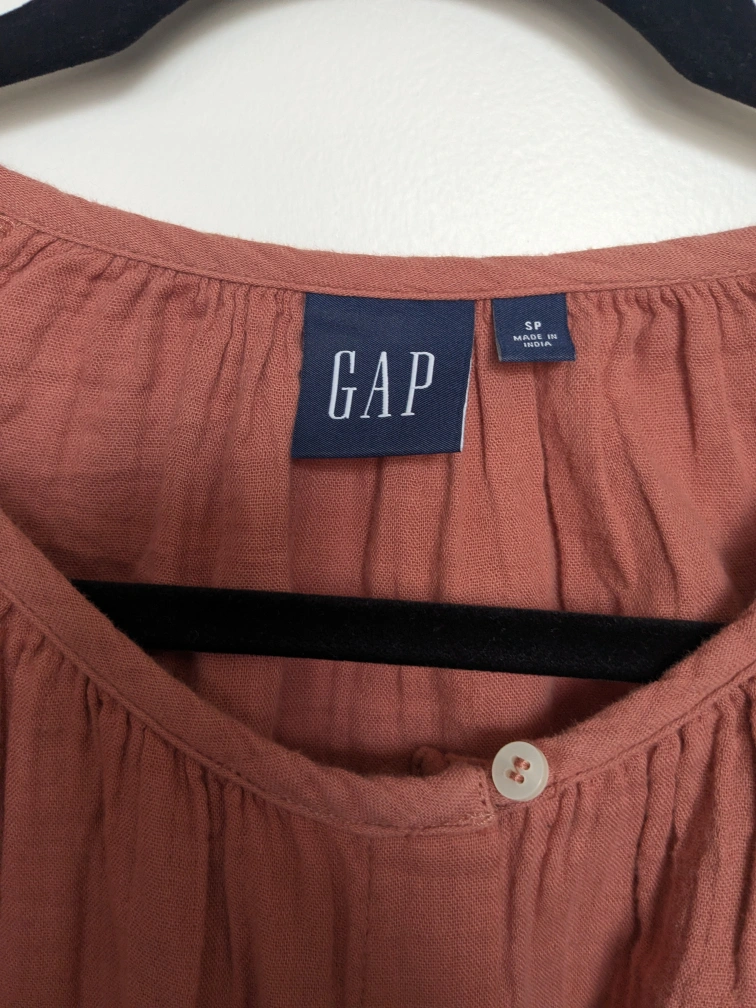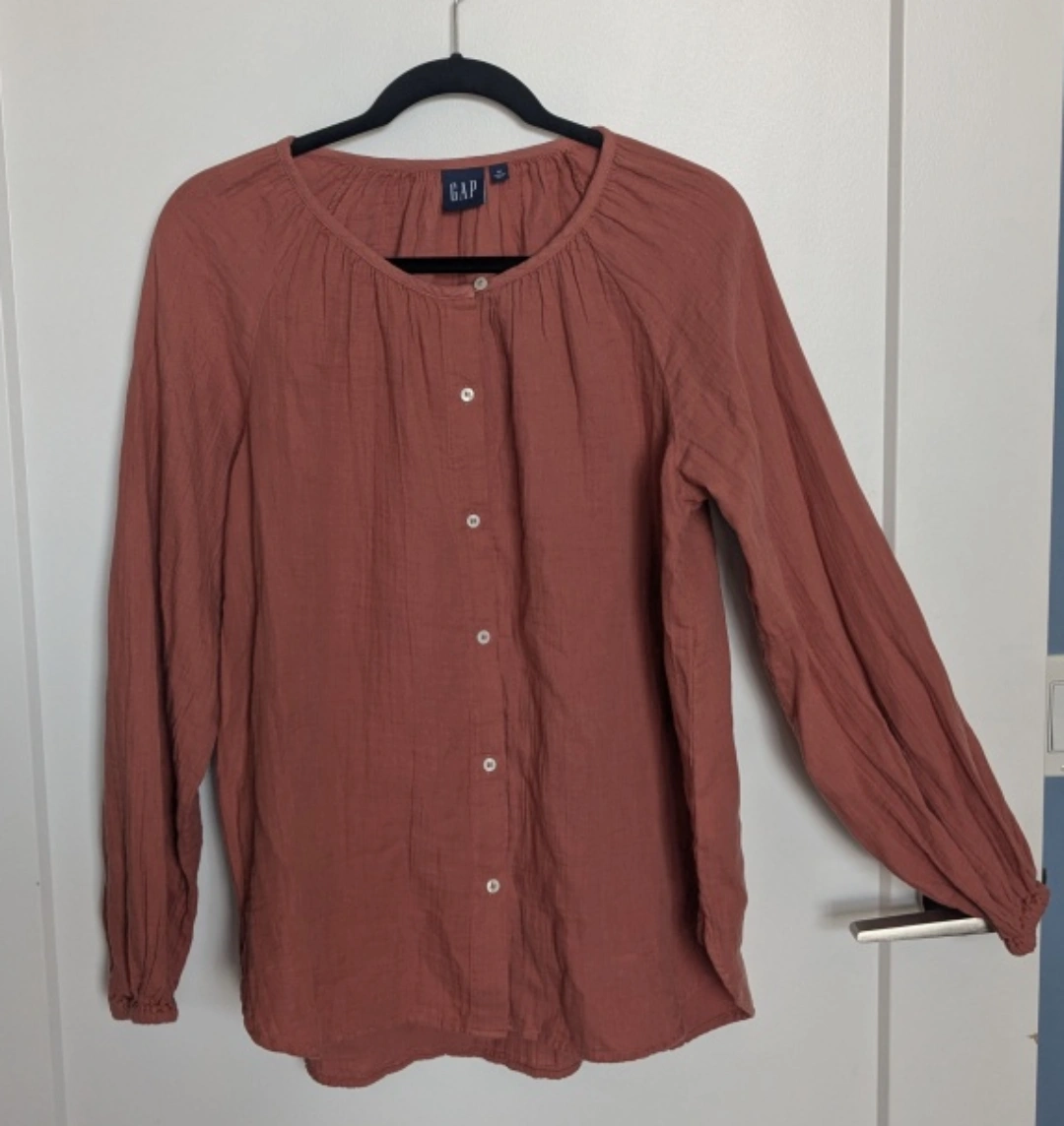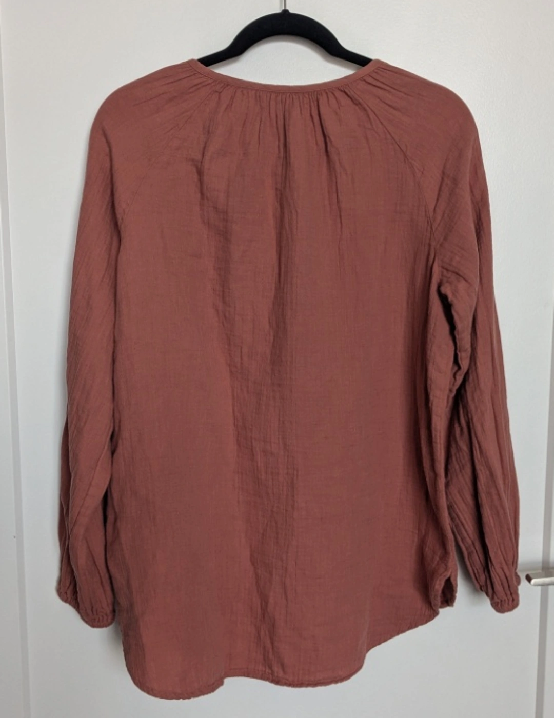 A Brand new and never worn linen terracotta blouse with some gorgeous button detailing and elastic bishop sleeves from The GAP! It's in size small but could fit up to a large. I also have the same top in yellow on my profile.