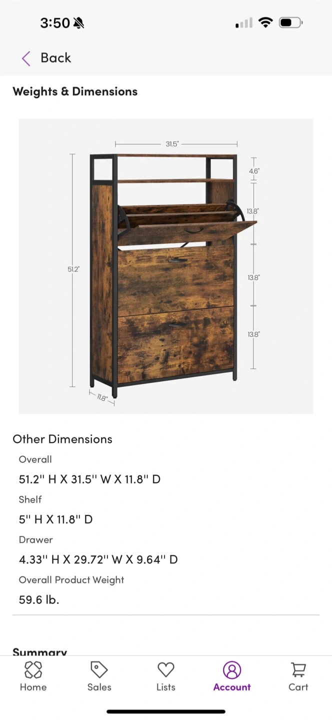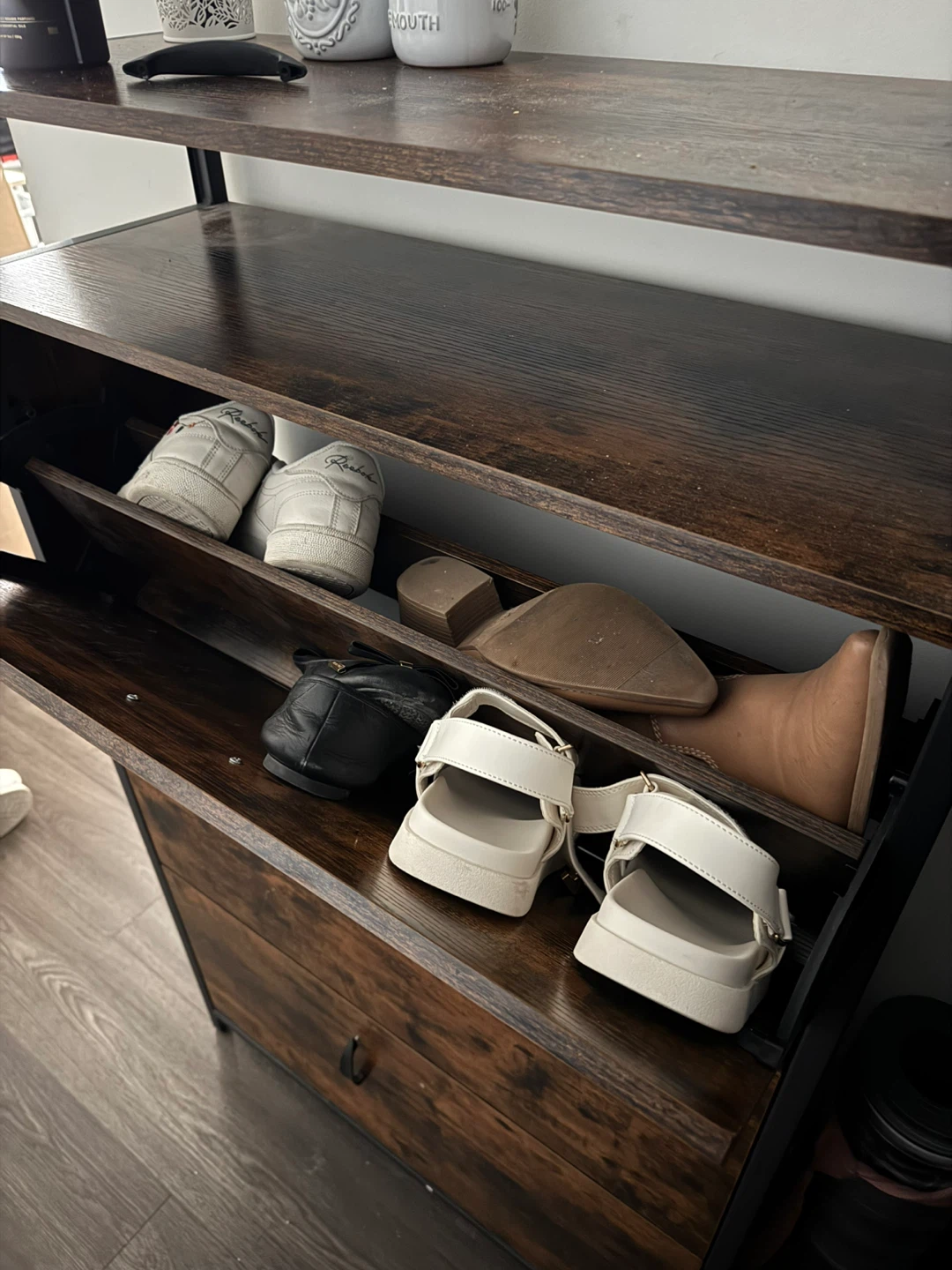 Will put handles back on before it goes to you. Looking to declutter your entryway? This rustic brown shoe storage cabinet is perfect! It features a stylish design with a wood grain finish and black metal frame. Keep your shoes organized and out of sight with this functional and attractive piece of furniture