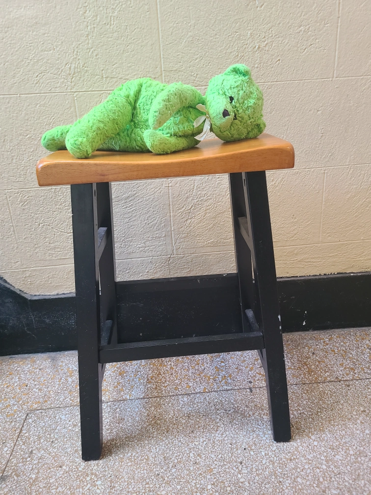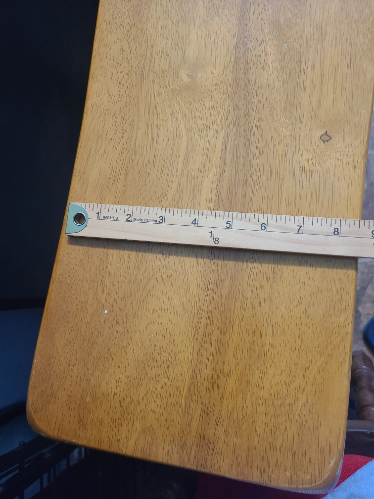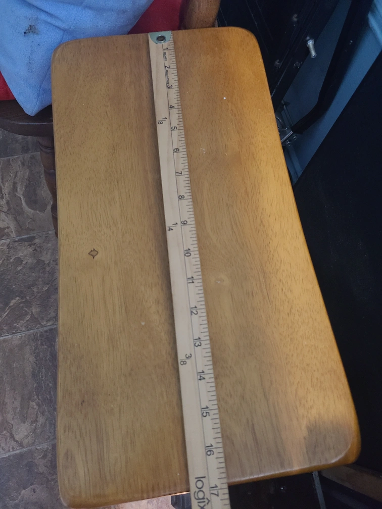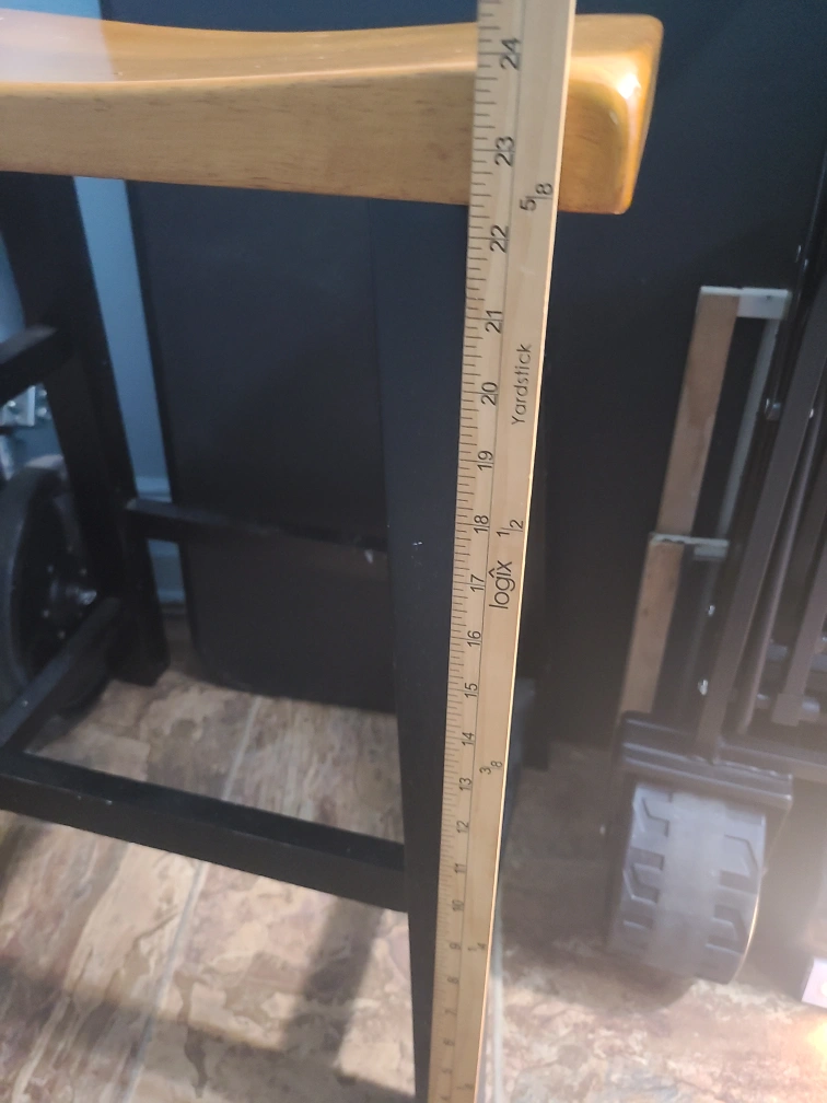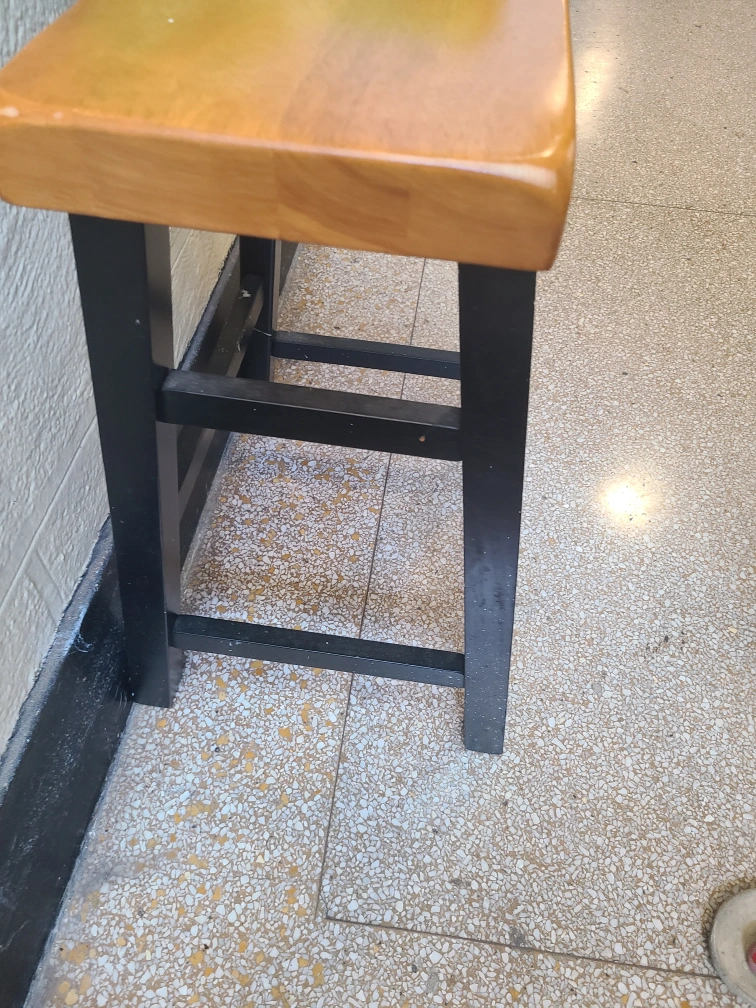 Selling a wooden stool that's perfect for adding a touch of rustic charm to your space! The stool has a light brown wooden top and black legs. The top measures approximately 17 inches in length and 8.5 inches in width. 24 inches tall.