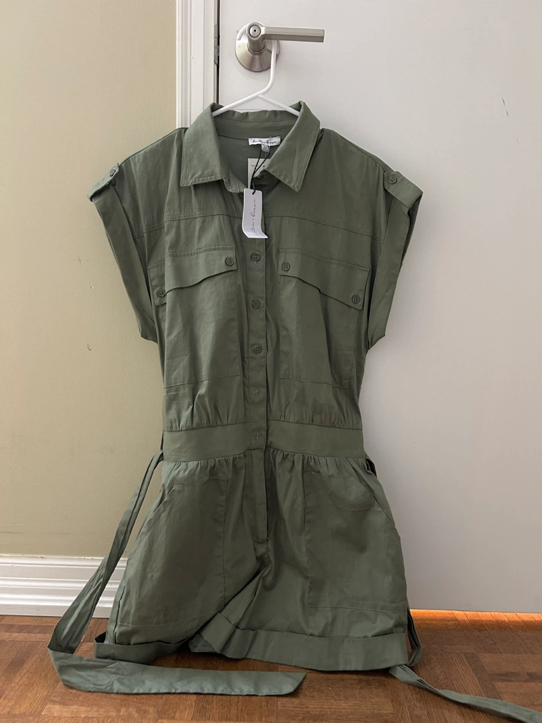Selling a cute olive green romper. It's a size small and in great condition. Perfect for a casual day out or dressing up for an evening. The material is lightweight and comfy, great for the warmer weather!