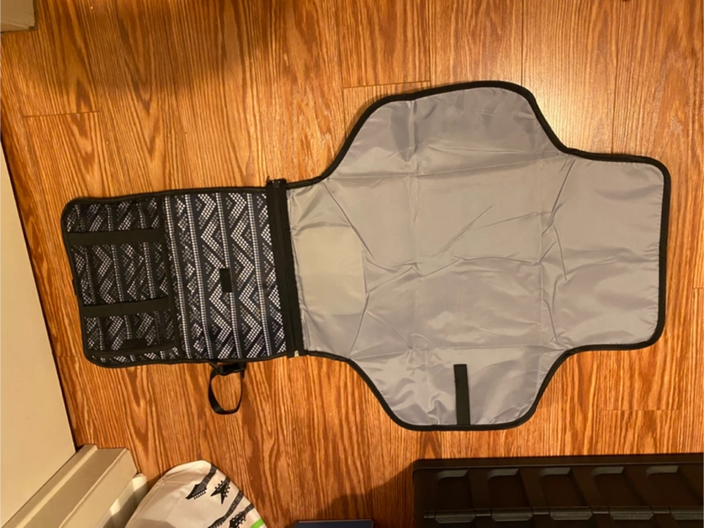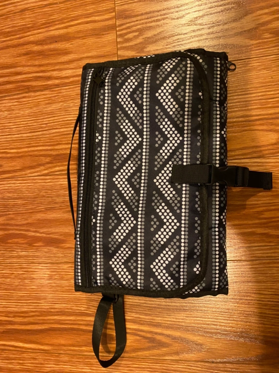 This portable baby changing pad is perfect for on-the-go diaper changes! It features a stylish black and white patterned exterior and a wipeable interior surface. It's compact and easy to carry, making it a must-have for parents