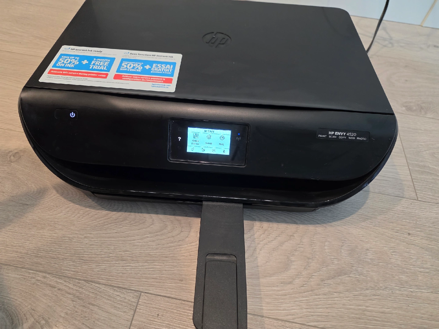 Selling a used HP Envy 4520 all-in-one printer. It can print, scan and copy! It's in good working condition and ready for a new home. Perfect for home or small office use. Uses HP 63 ink. Requires new black ink. Color ink about 3/4 full.