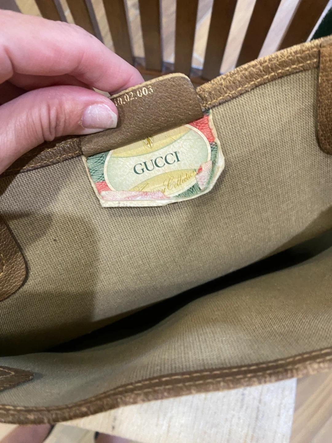 Selling a Gucci tote bag with the iconic GG monogram pattern. It features a brown canvas with a pocket on the front and green and red striped straps. It's in great condition and ready for a new home!
