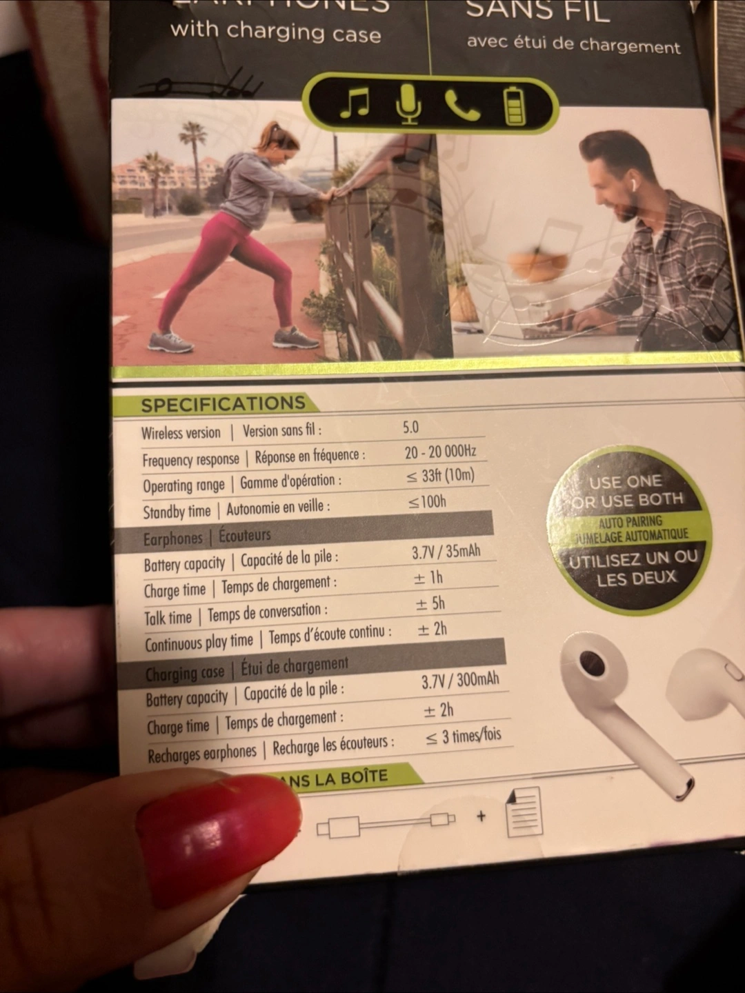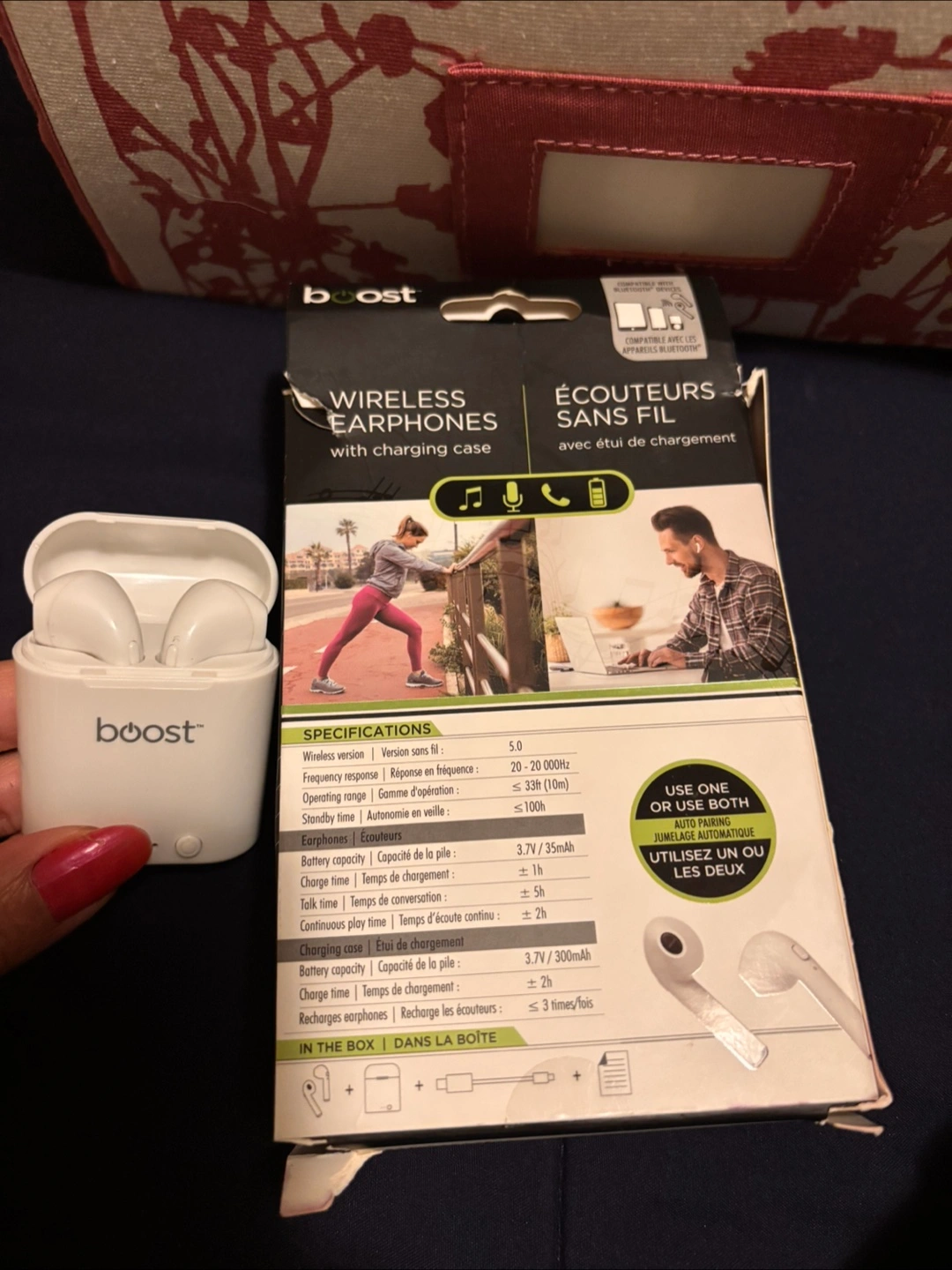 Selling a pair of Boost wireless earphones, complete with their charging case! They're white and in great condition. The box includes the earphones and the charging case. These earphones are compatible with Bluetooth devices. You can use one or both at the same time. They have a wireless version of 5.0 and a frequency response of 20-20 000Hz. The charging case has a battery capacity of 3.7V/300mAh and takes about 2 hours to charge