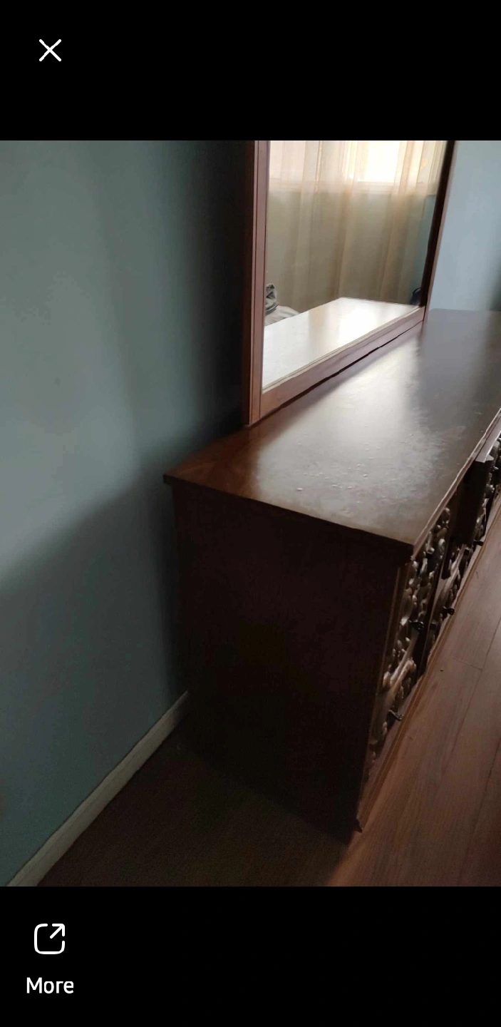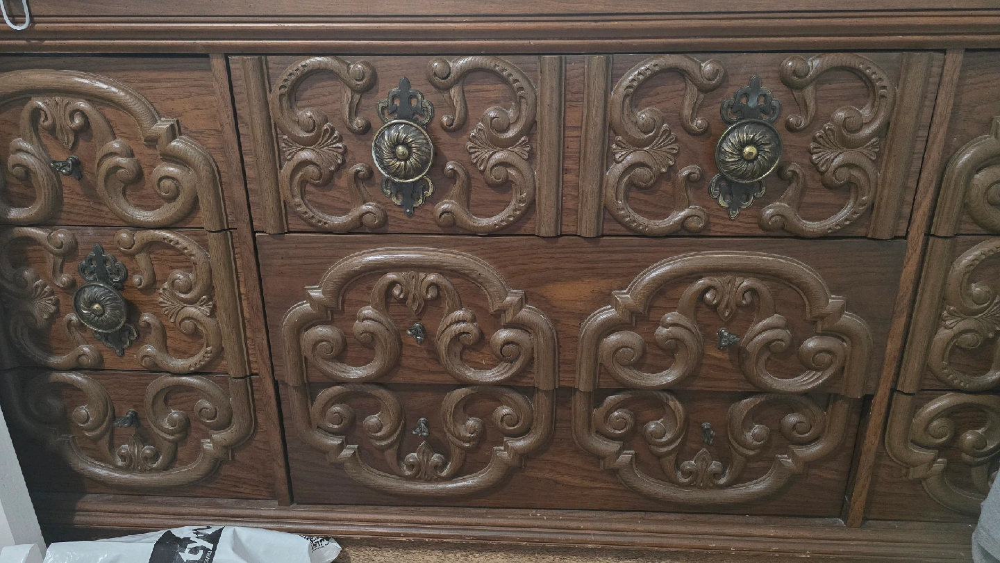 Selling a vintage wood dresser with a matching mirror! The dresser features ornate carvings and brass hardware. It's a unique piece that would add character to any bedroom. The mirror sits nicely on top of the dresser.