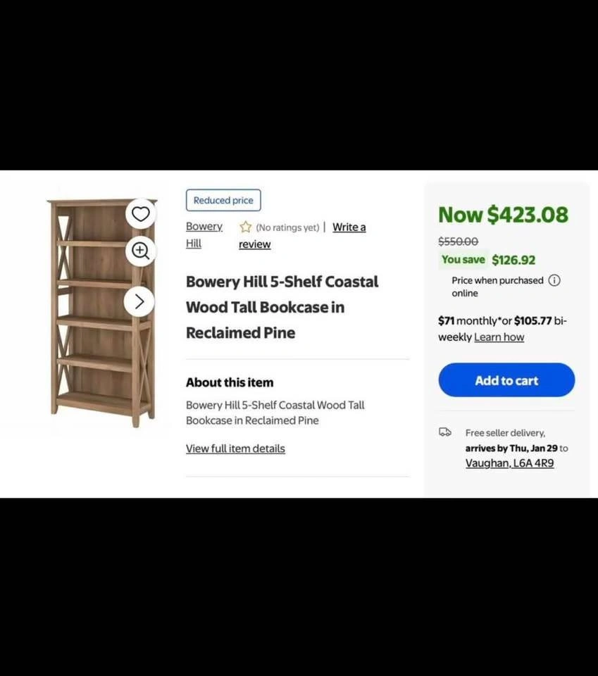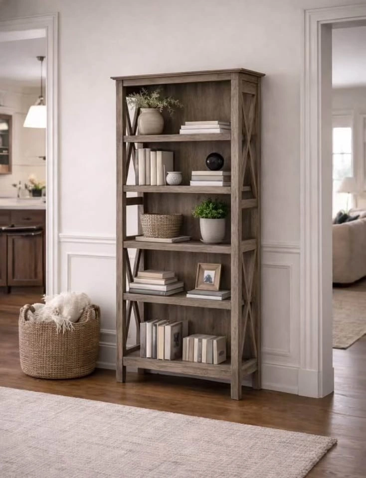 Brand new in box. Beautiful reclaimed-pine look manufactured wood bookshelf with 5 spacious shelves, including 3 adjustable shelves for flexible styling and storage. Sturdy, warm wood tone with farmhouse frame side detailing. Perfect for a living room, office, or bedroom.