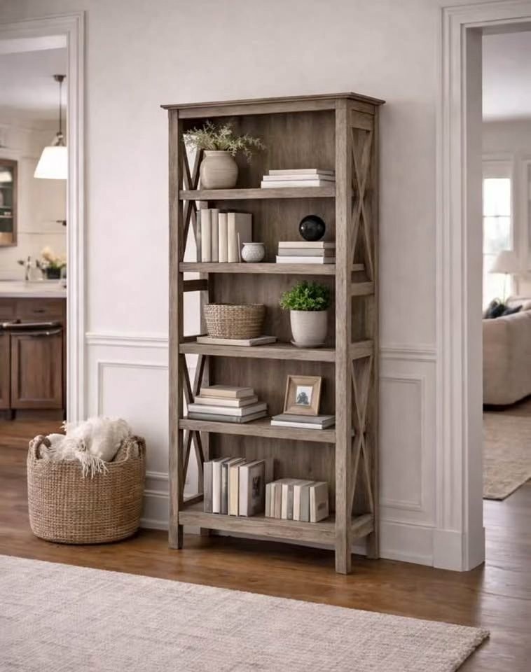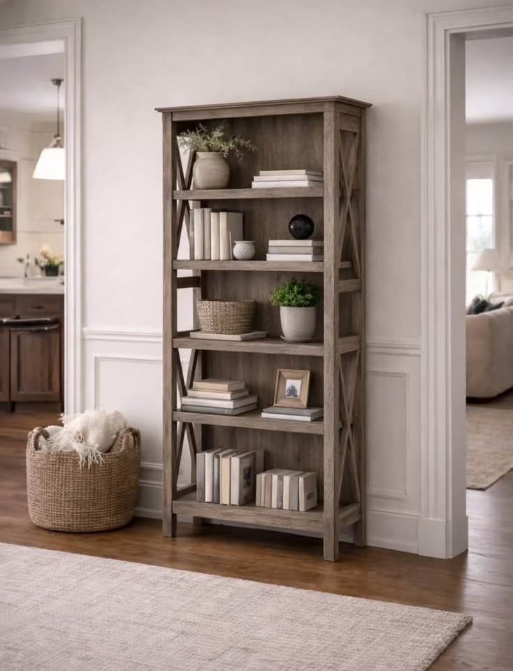 Brand new in box. Beautiful reclaimed-pine look manufactured wood bookshelf with 5 spacious shelves, including 3 adjustable shelves for flexible styling and storage. Sturdy, warm wood tone with farmhouse frame side detailing. Perfect for a living room, office, or bedroom.