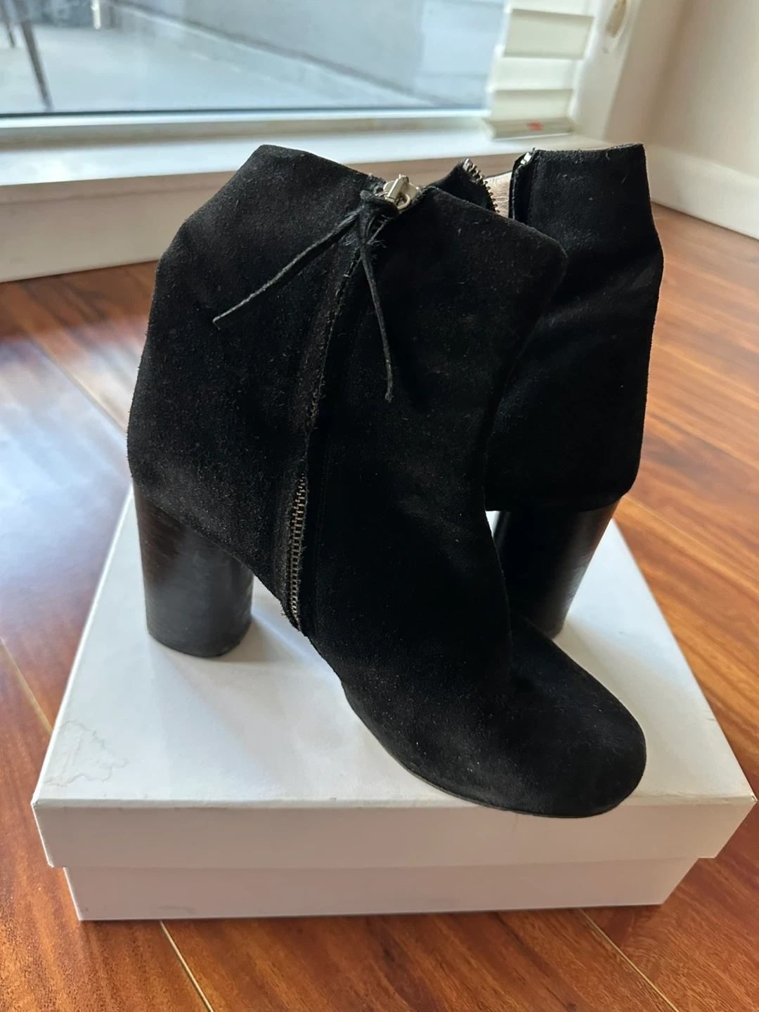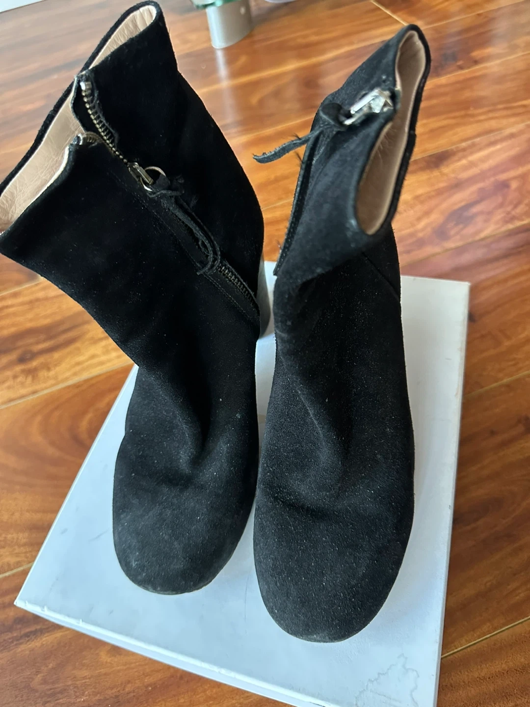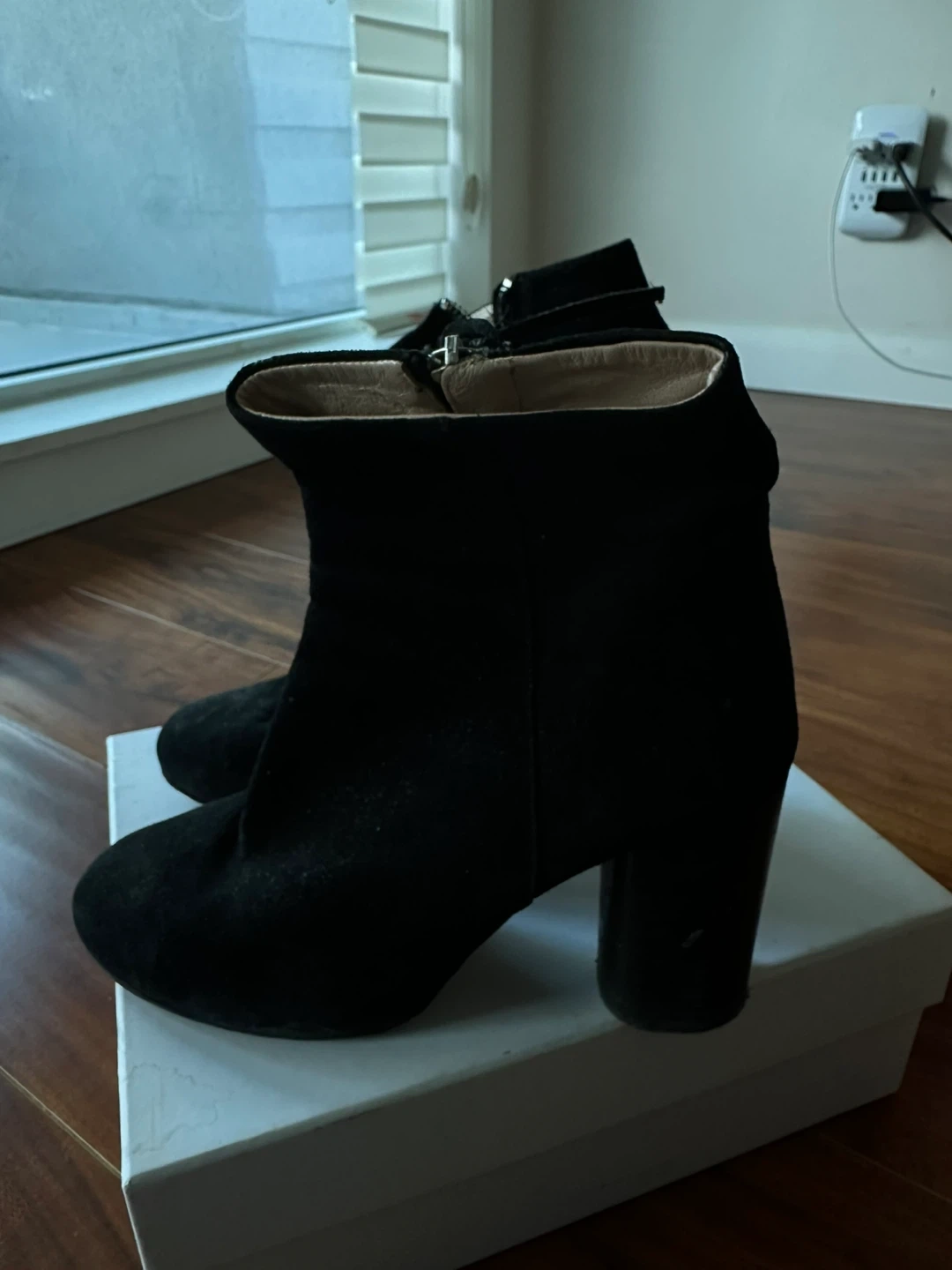 Selling a pair of black suede ankle boots. They have a zipper closure and a comfortable heel height. These stylish boots are perfect for any occasion and are in great condition! Really good quality european boots original price $600