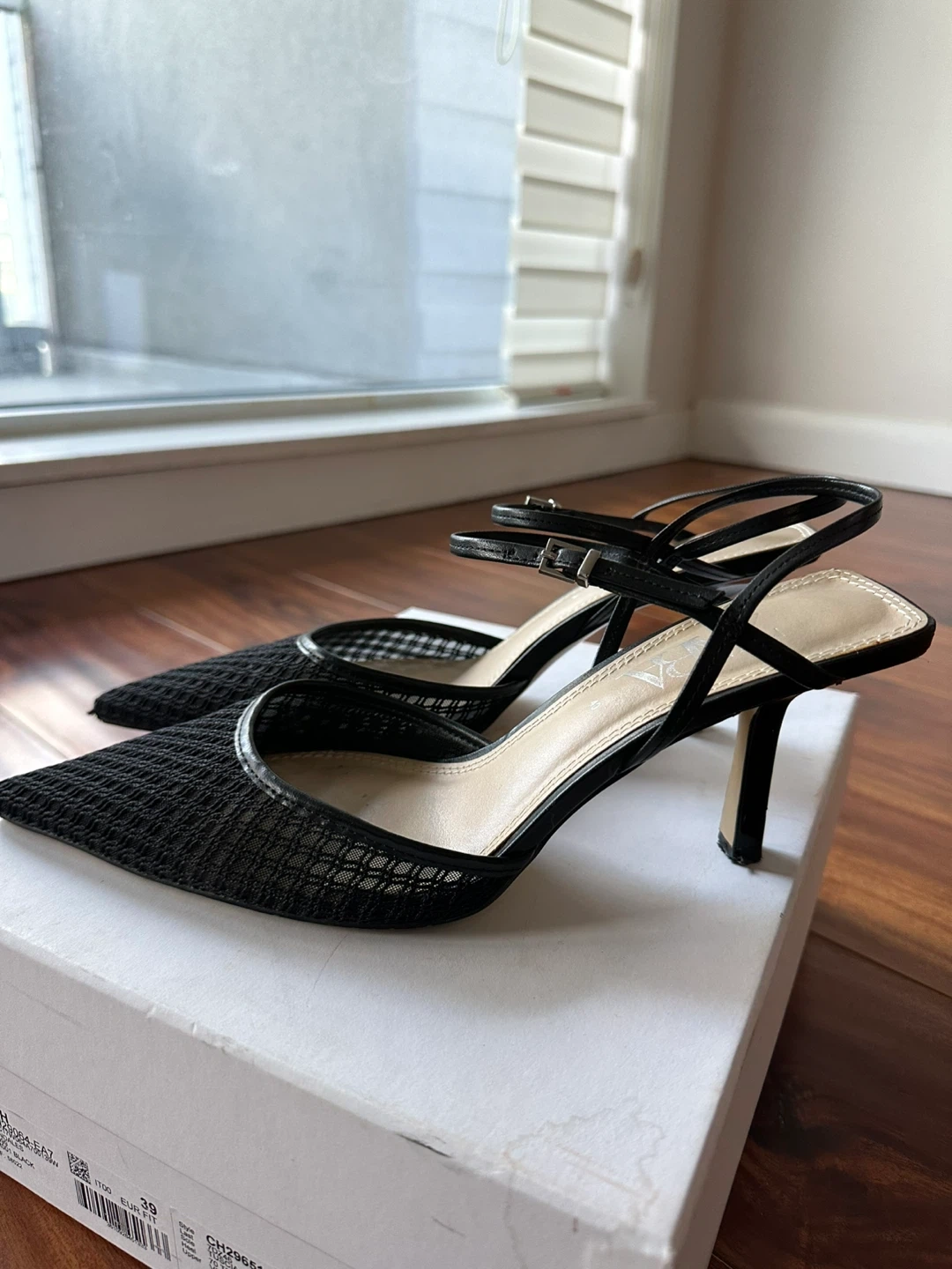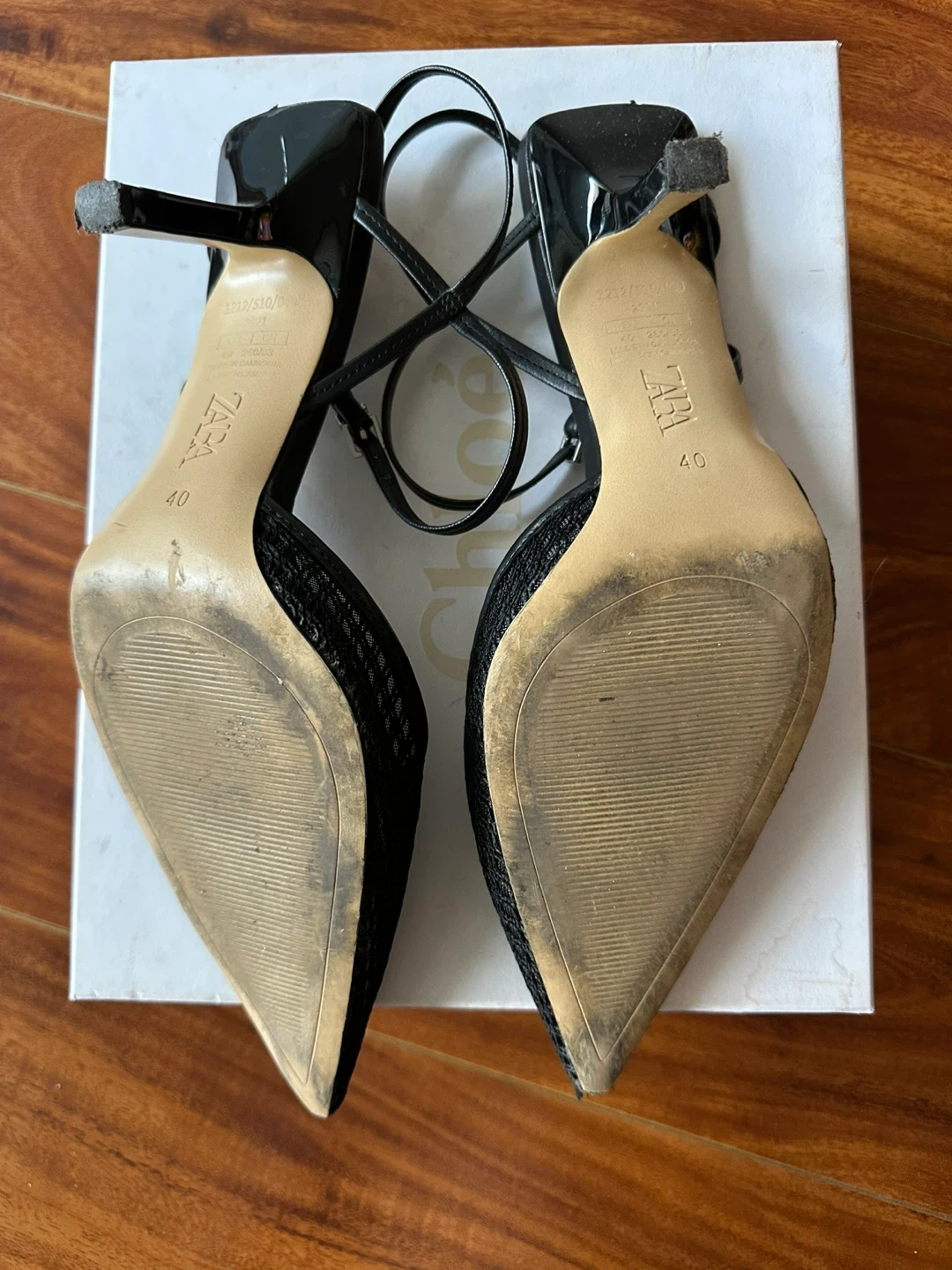Selling a pair of Zara black mesh heeled sandals. They are a size 40. Great for a night out! Super comfortable