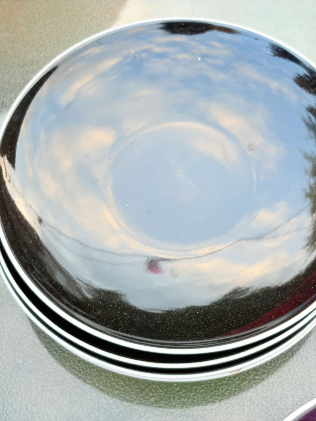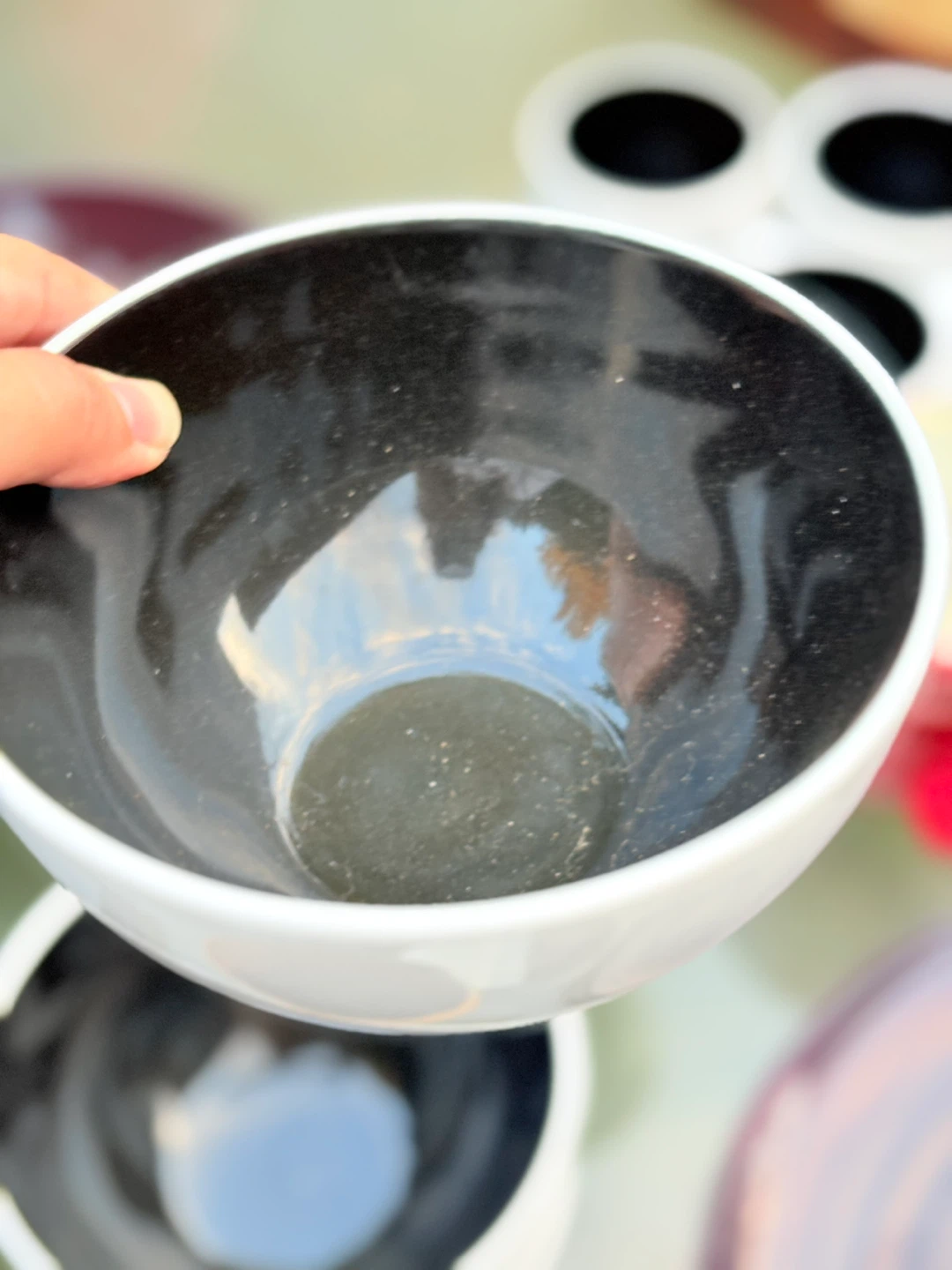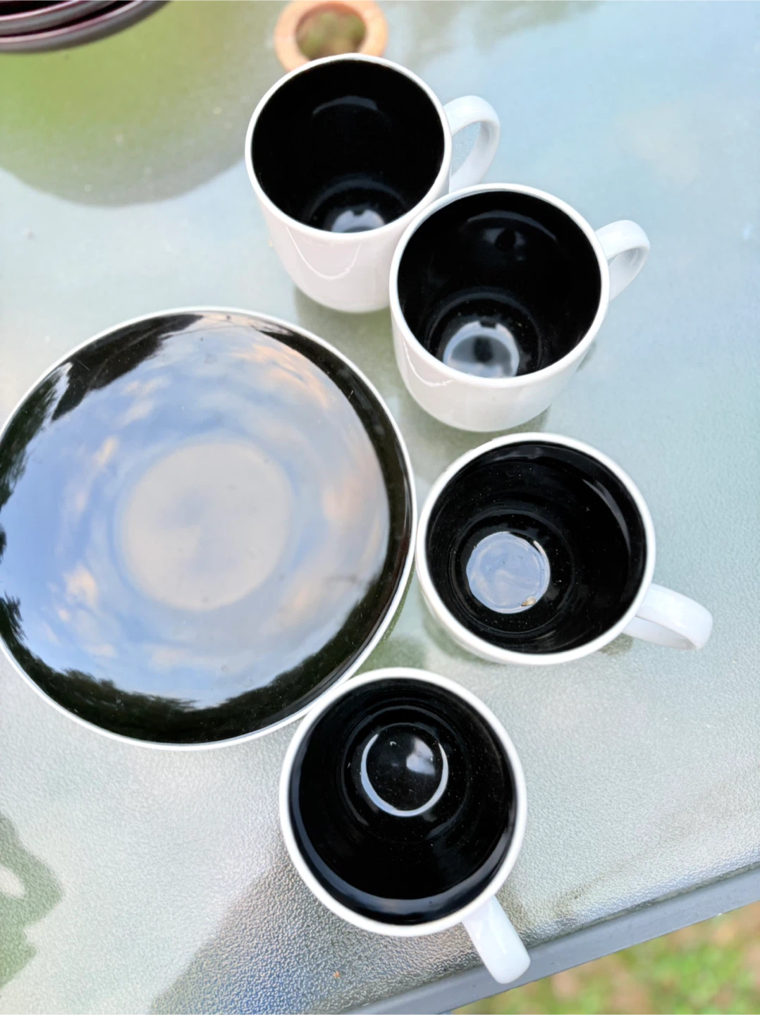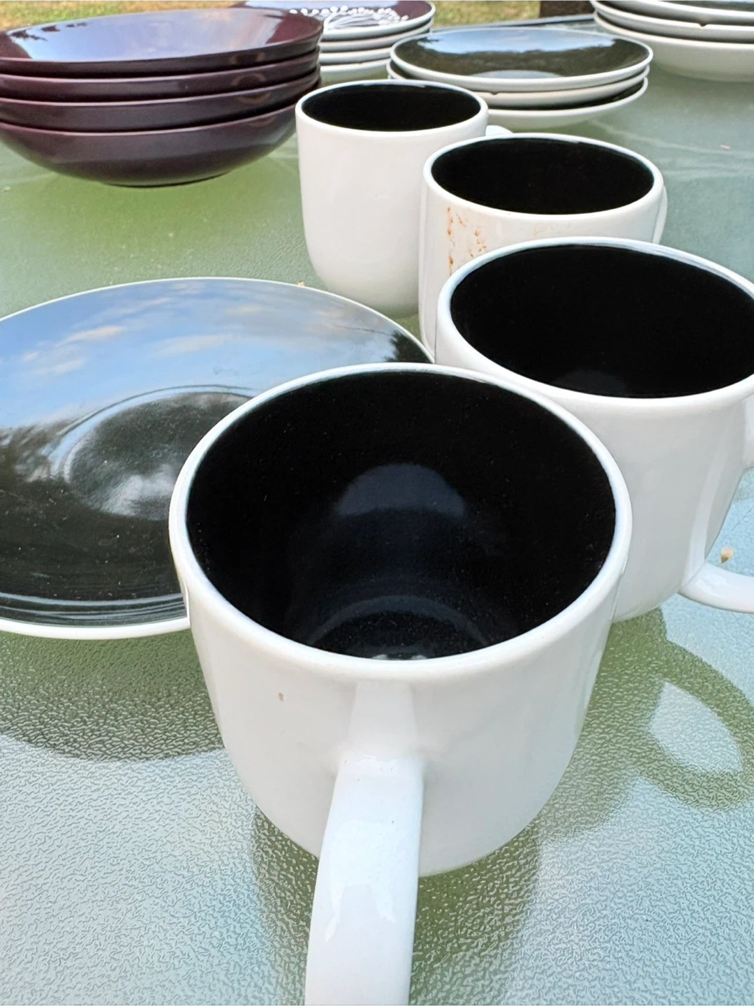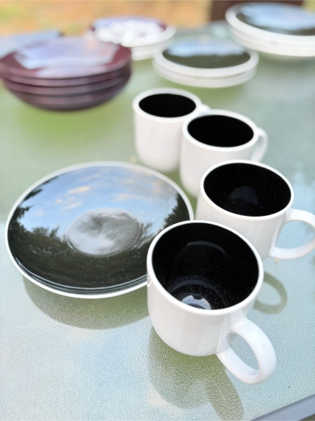 Selling a set of black and white dinnerware! Includes bowls, plates, and mugs. Perfect for everyday use or entertaining. They're in great condition and ready for a new home