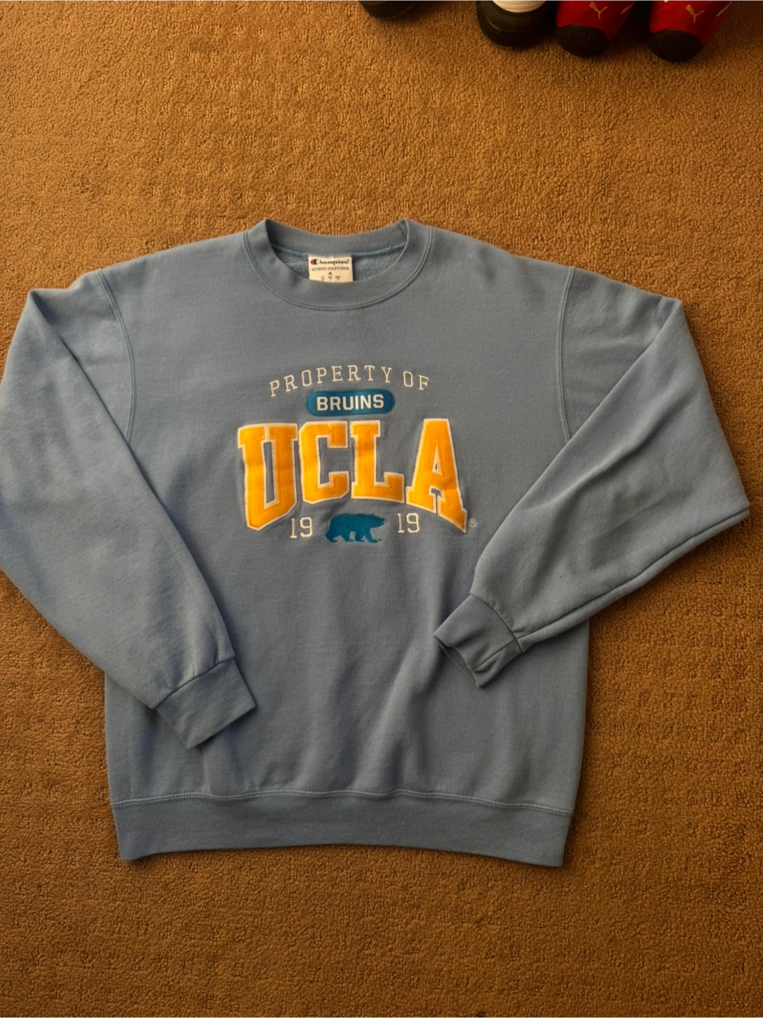 Cozy Champion crewneck sweatshirt in a light blue colour! It features the UCLA Bruins logo. Size is small and in great condition, ready for a new home