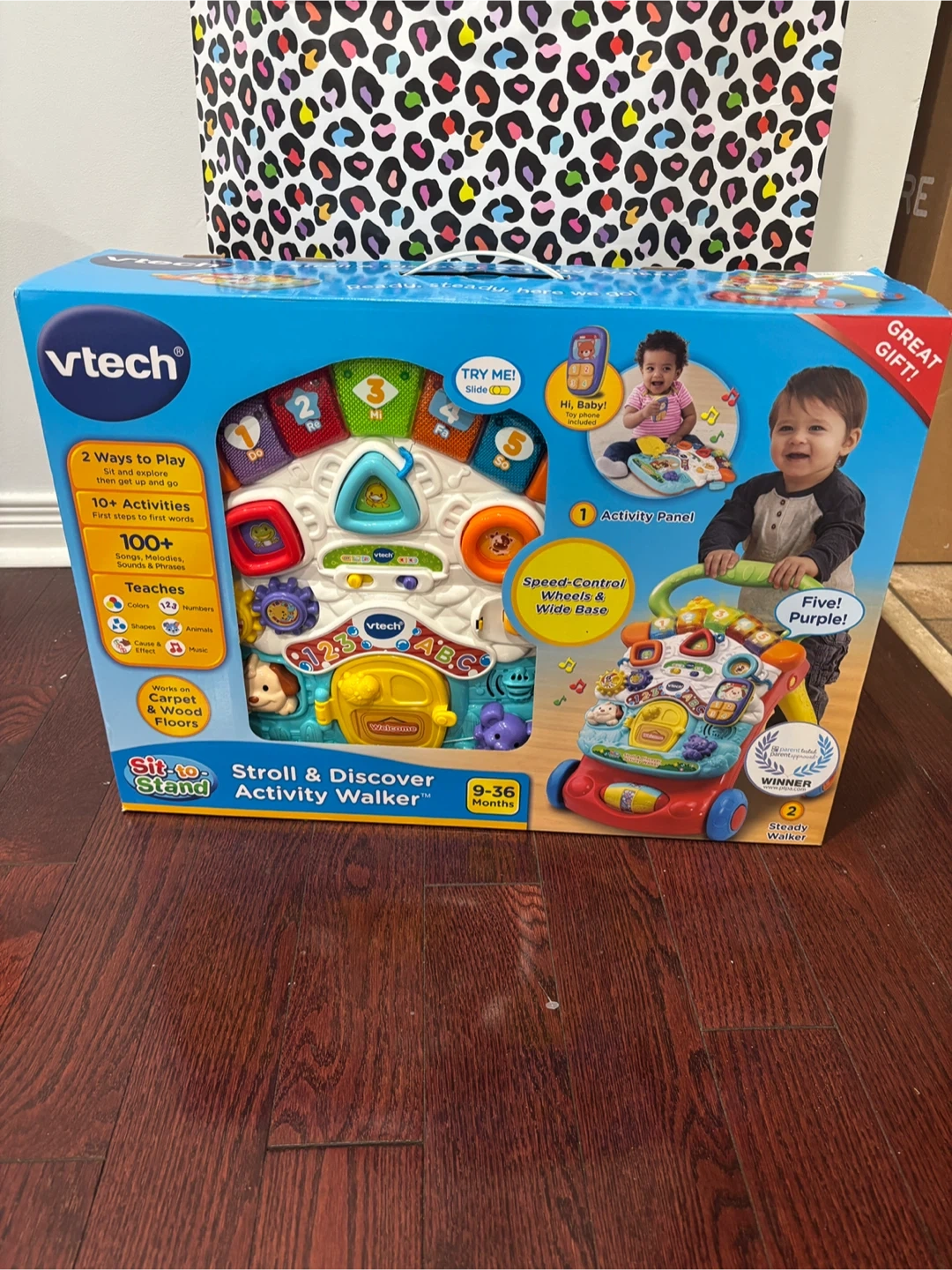 This VTech Stroll & Discover Activity Walker is perfect for little ones aged 9-36 months! It's got tons of activities to keep them entertained, including songs, melodies, sounds, and phrases. It teaches colours, shapes, animals, and numbers. Great for use on both carpet and wood floors!