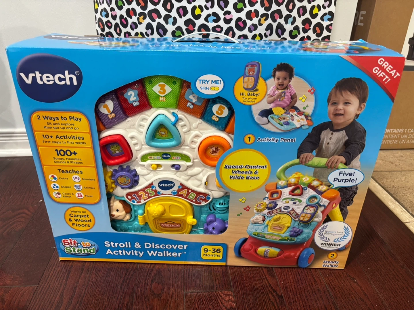 This VTech Stroll & Discover Activity Walker is perfect for little ones aged 9-36 months! It's got tons of activities to keep them entertained, including songs, melodies, sounds, and phrases. It teaches colours, shapes, animals, and numbers. Great for use on both carpet and wood floors!