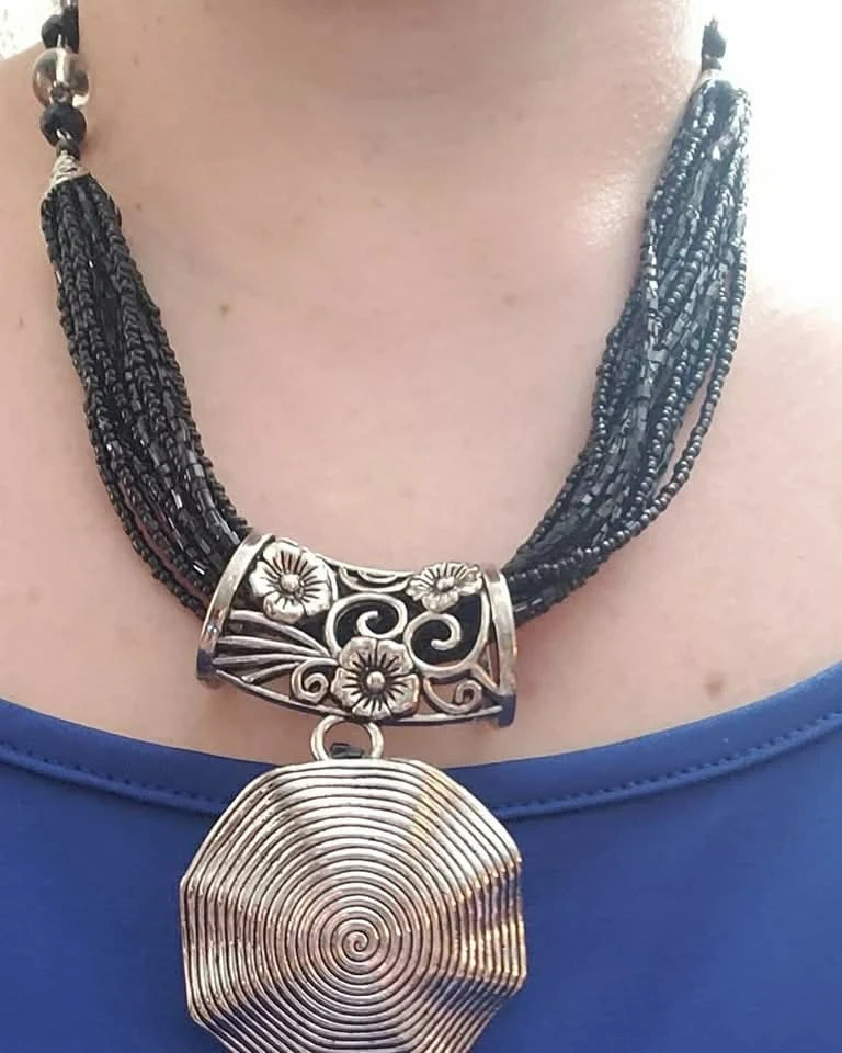 Selling a new handcrafted beautiful black beaded necklace. It features a unique silver pendant with a floral design and a spiral centre. It's in great condition and ready to add some flair to your outfit!