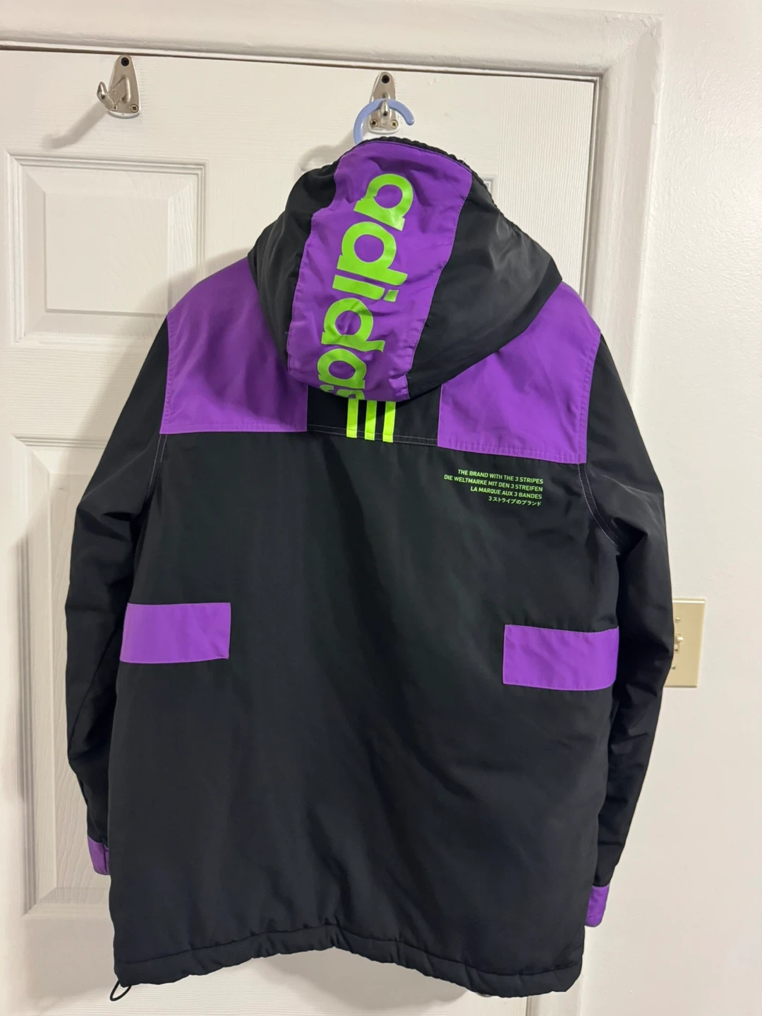Stylish Adidas winter jacket in black and purple! Size L. Perfect for staying warm and looking cool this winter season