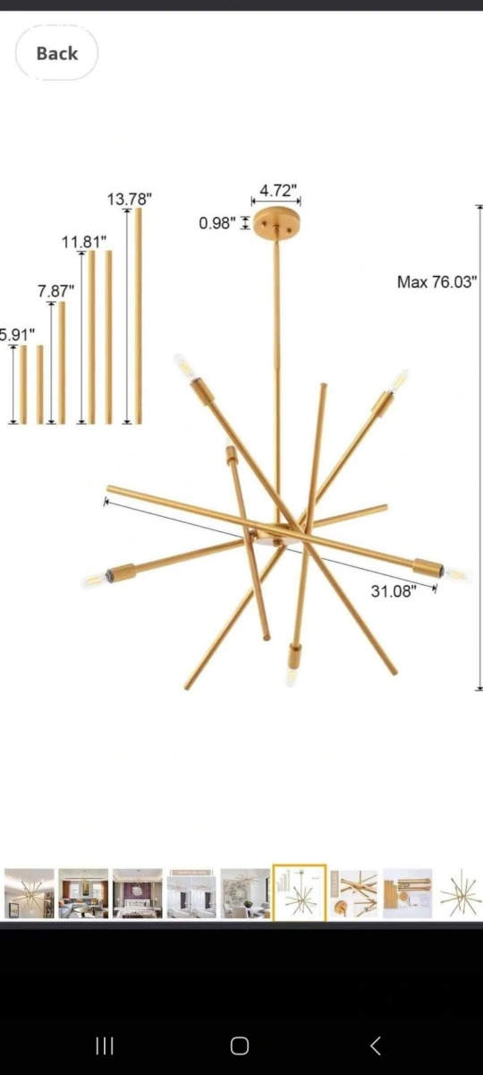 Selling a gold sputnik style chandelier! It's a modern and stylish lighting fixture. The dimensions are: Max 76.03", 31.08", 13.78", 11.81", 7.87", 5.91", 4.72", and 0.98".