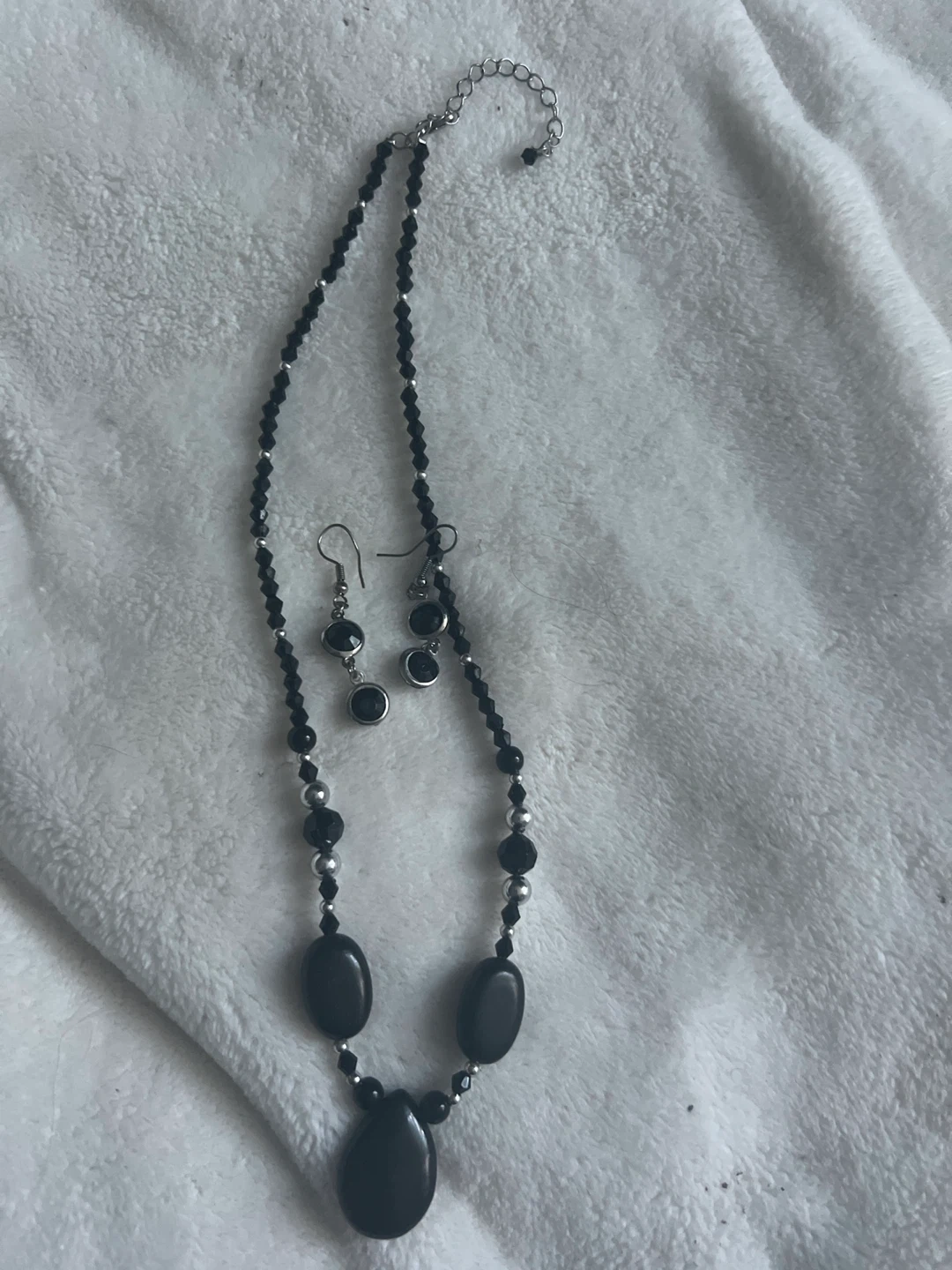 Selling a cute black beaded necklace with matching earrings. The necklace features a mix of small black and silver beads, along with larger black oval beads and a teardrop pendant. The earrings are simple black studs. Perfect for adding a touch of elegance to any outfit!
