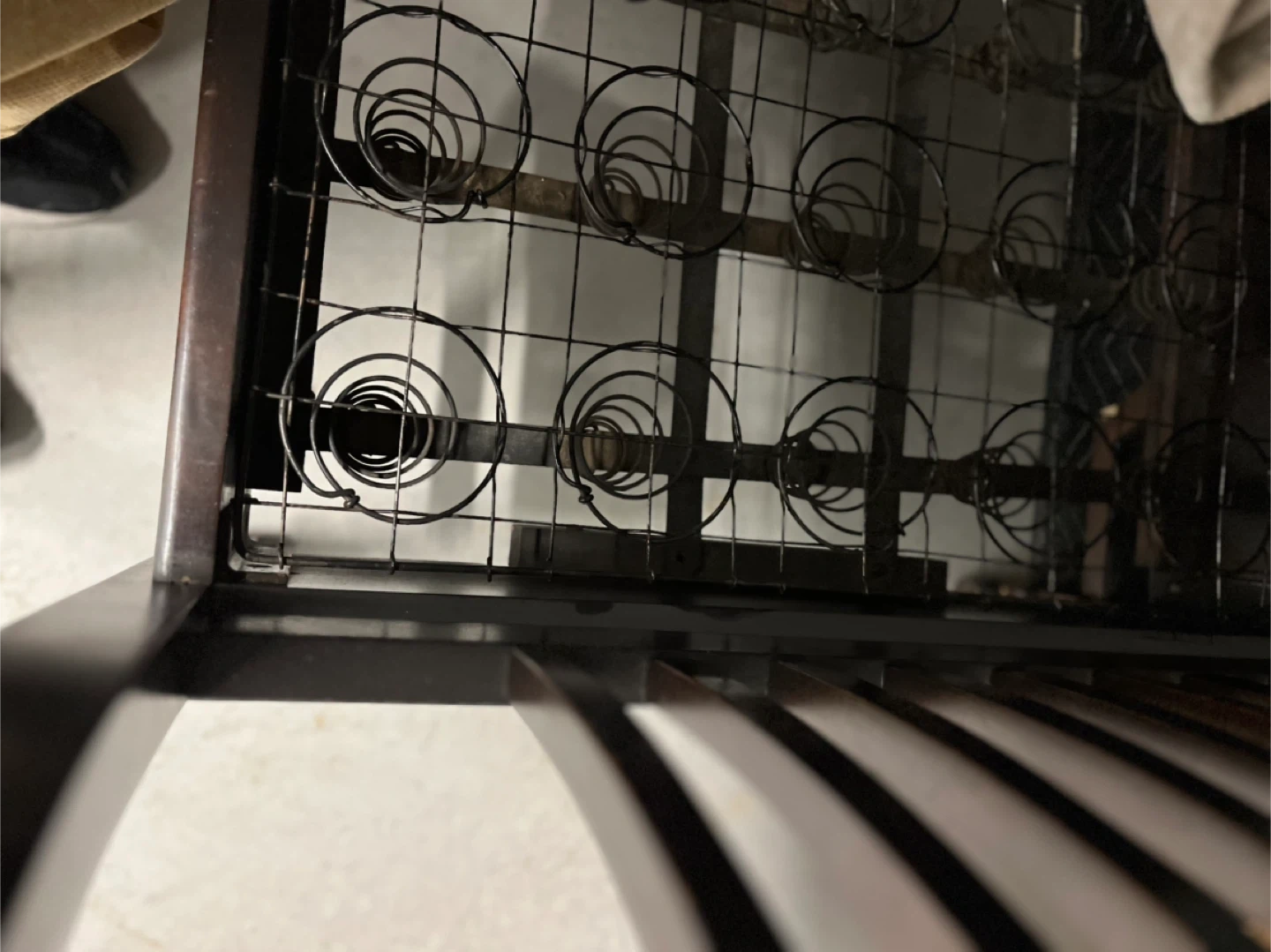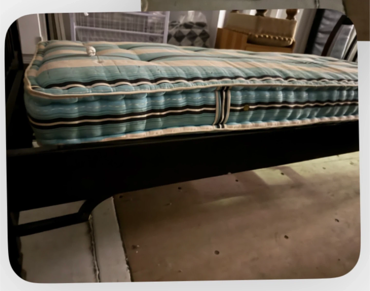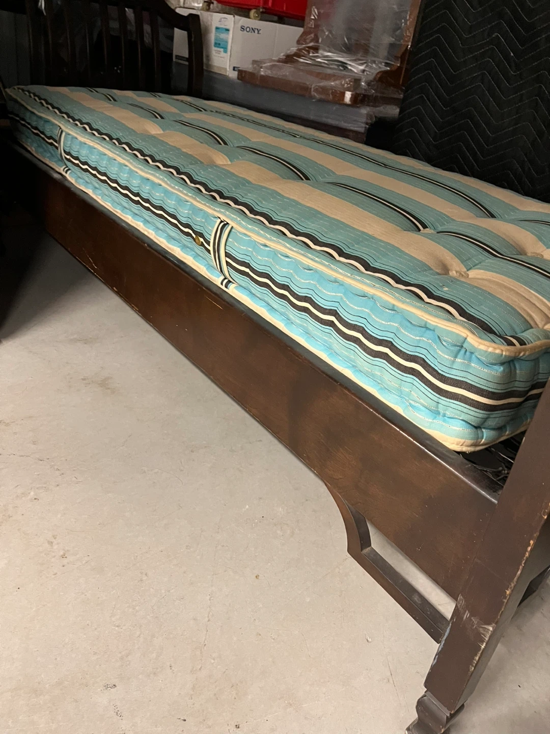 Selling a charming antique daybed. It measures approximately 6’5”in length. The frame is a dark wood mahogany , spring wire mattress base and the mattress has a striped pattern in shades of blue, beige, and black. A unique and beautiful piece to add character to any room!