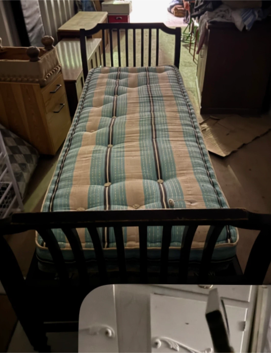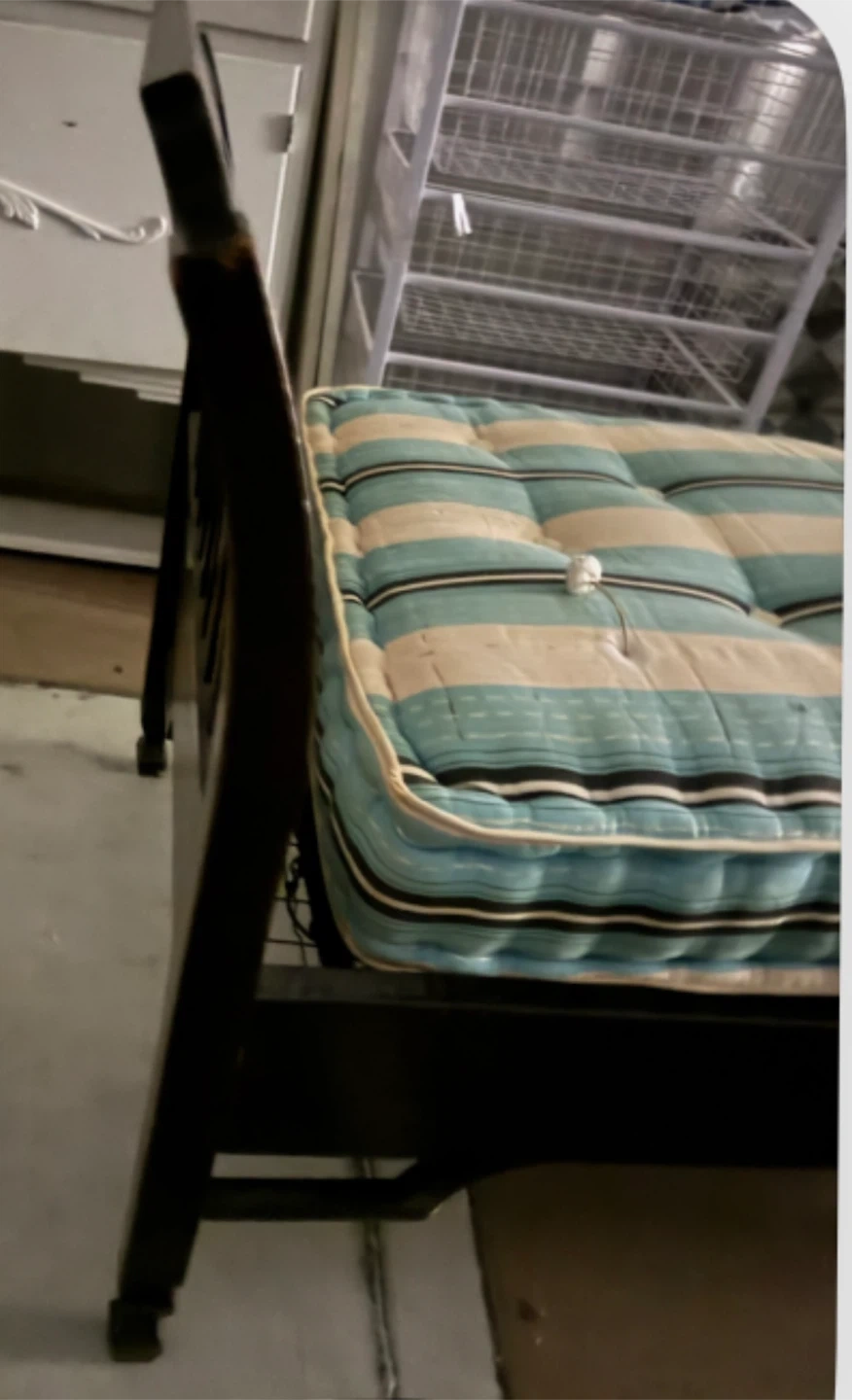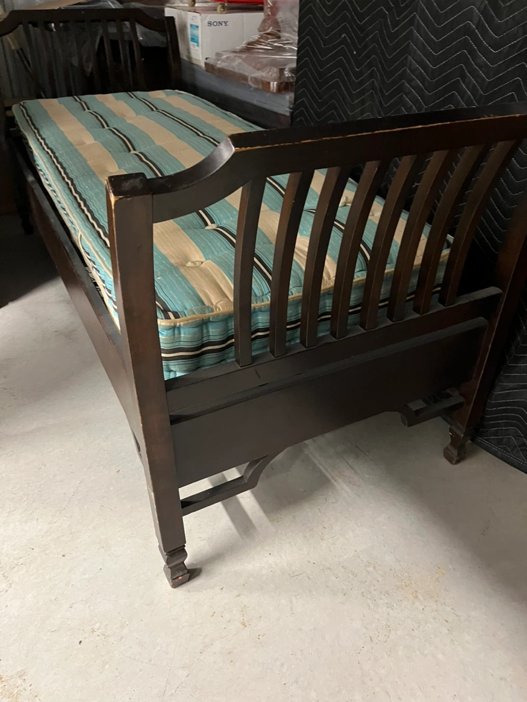 Selling a charming antique daybed. It measures approximately 6’5”in length. The frame is a dark wood mahogany , spring wire mattress base and the mattress has a striped pattern in shades of blue, beige, and black. A unique and beautiful piece to add character to any room!