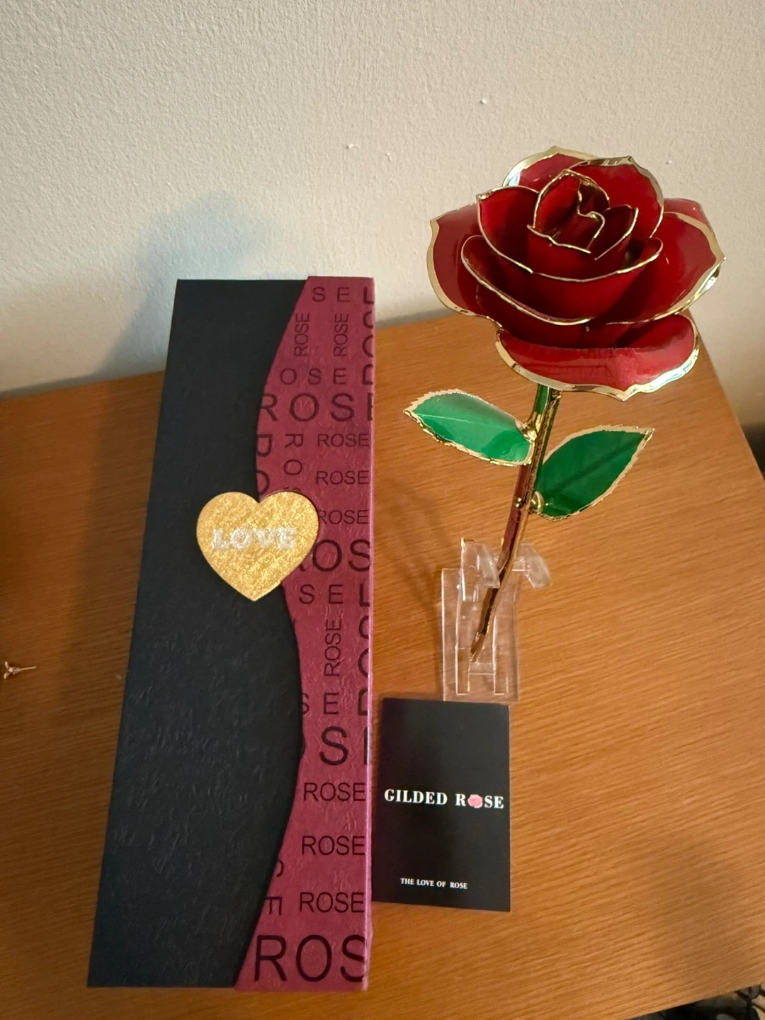 Selling a beautiful Gilded Rose in red with gold trim. It comes with the original box and a clear stand to display the rose. This would make a lovely gift for someone special!