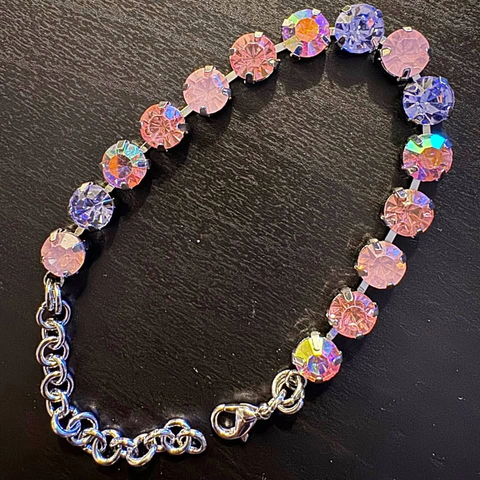 Add this unique silver tone adjustable chain tennis bracelet with ombre baby pink, rose pink, lavender, magenta, purple, pastel pink, aurora borealis pink square cut synthetic crystals to your jewelry collection! Lovely, lightweight and feminine bracelet that gives me serious Bridgerton vibes! 🌸🌺 Lovely piece for a wedding or would make a beautiful gift for Christmas, Valentine’s Day, Mother’s Day or for a loved one’s birthday.✨💖