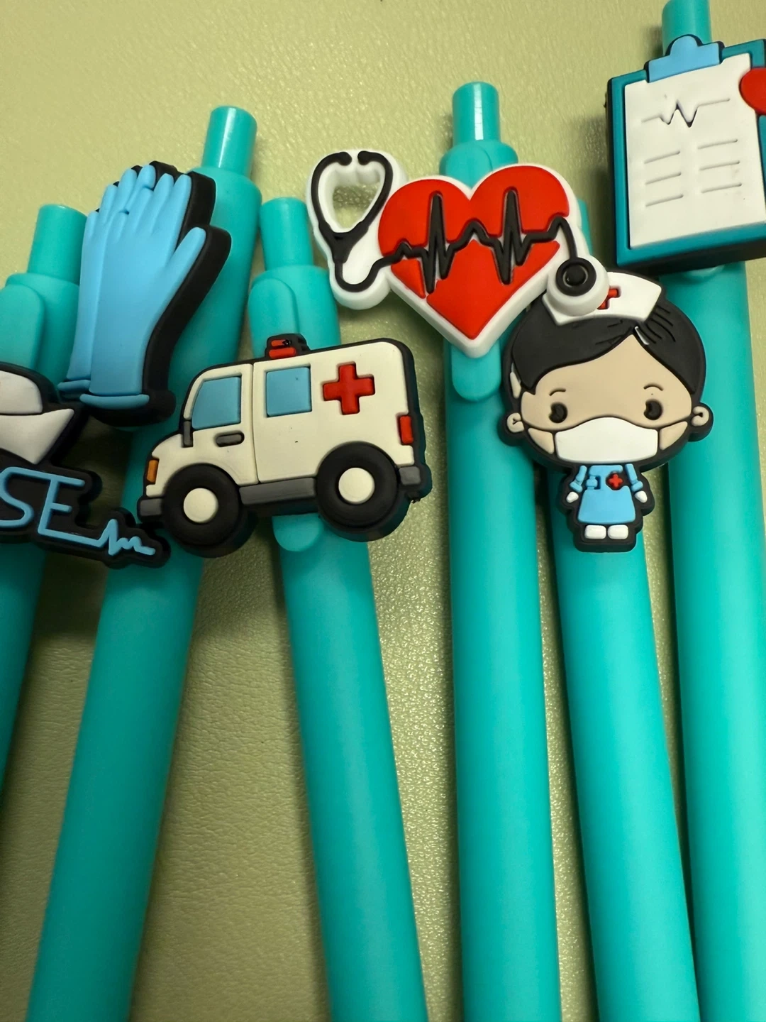 I have a set of 22 teal pens with cute nurse-themed charms on top! They're perfect for anyone in the medical field or just a fun addition to your stationery collection. All for $30 or $1.50 each.