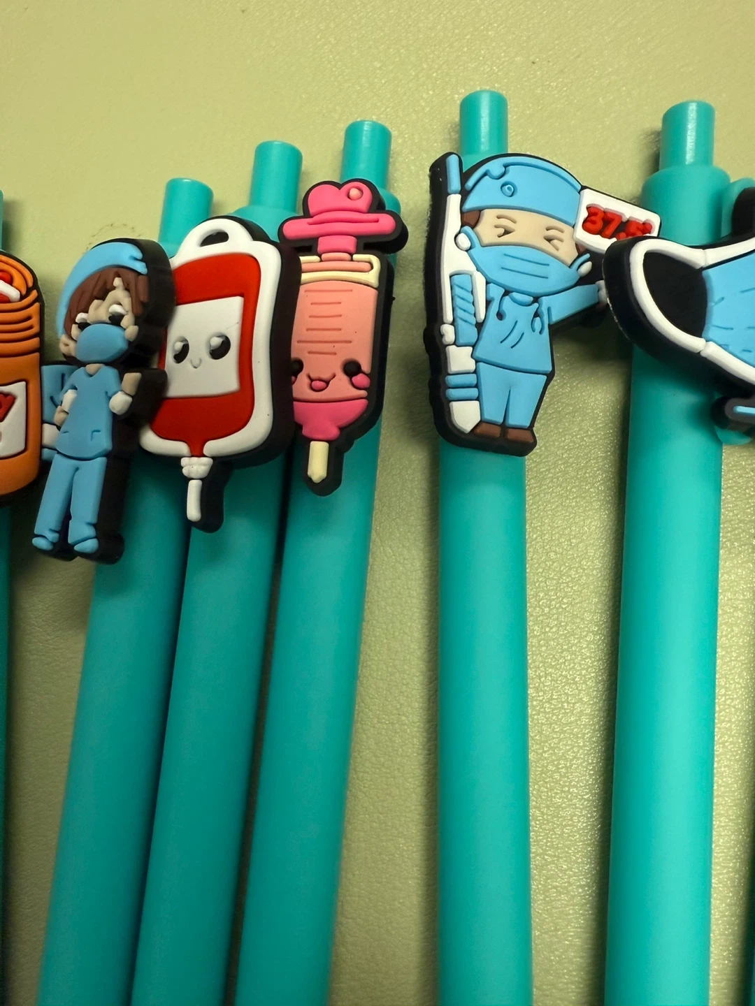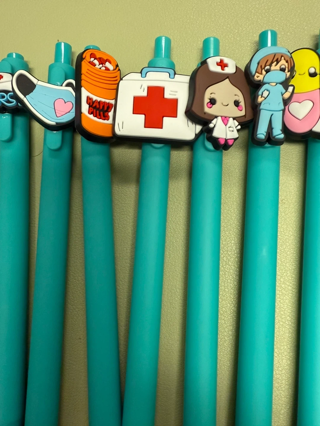 I have a set of 22 teal pens with cute nurse-themed charms on top! They're perfect for anyone in the medical field or just a fun addition to your stationery collection. All for $30 or $1.50 each.